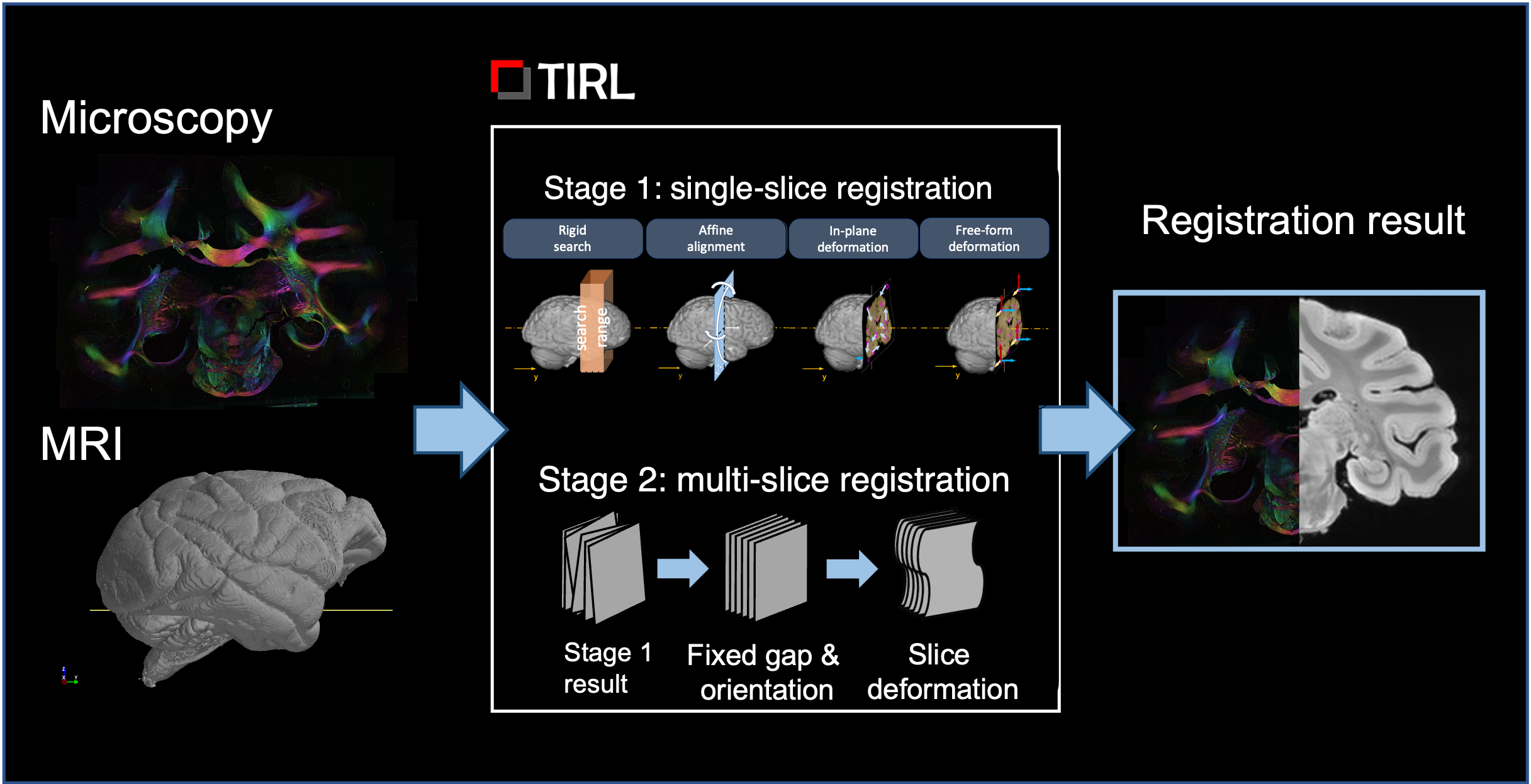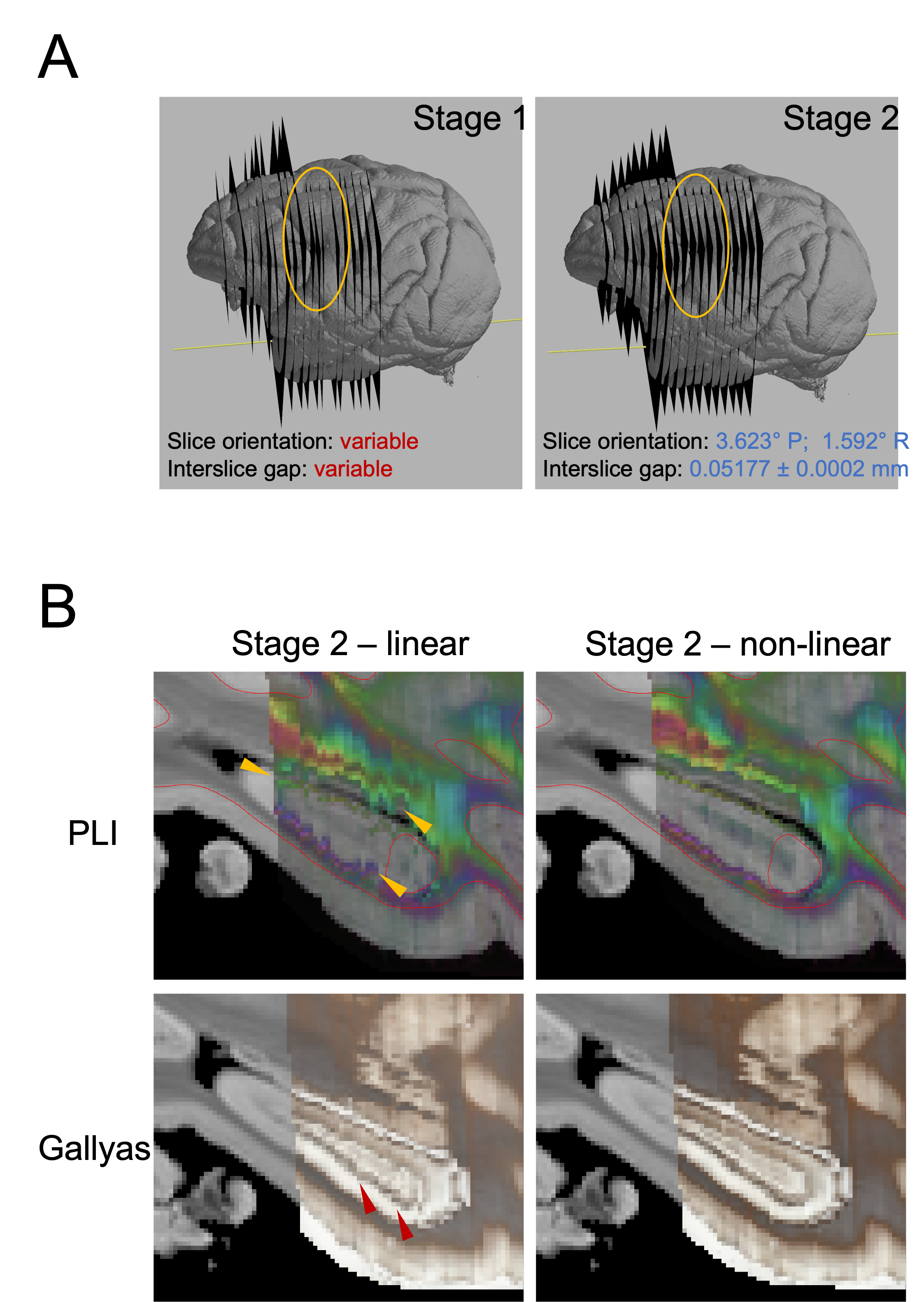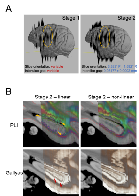 For this work, we selected 290 microscopy sections (96 Nissl, 95 Gallyas, 99 PLI) from the anterior half of the BigMac brain for registration with the structural MRI (multi-gradient echo, 0.3 mm/voxel isometric). Our registration method utilises information about how the tissue was sectioned to constrain the optimisation: that Nissl, Gallyas and PLI slices were acquired in order, with a nominal separation of 50 um (the thicknesss of each section), and sections with the same microscopy contrast were repeated 350 um throughout the brain.The registration consisted of two stages (Fig.2). In Stage 1, each slice’s position and orientation in MRI space were optimised independently from other slices, given a starting estimate. The optimisation process involved a highly parallelised grid search over the 6 rigid parameters, followed up by gradient-free BOBYQA [7] optimisations at 0.6mm and 0.3mm resolutions to minimise the Modality-Independent Neighbourhood Descriptor (MIND) metric [8].In Stage 2, the pre-registered slices were recruited successively in batches of 60-120-180…, starting from the most well-aligned slice. For each batch, a robust slice orientation was determined based on the outlier-free group average, and the 6 rigid parameters were re-optimised from this new initial value at 0.15mm resolution. After the last batch, the slice orientations were replaced by the robust group average and held constant, while the positions of the slices were reoptimized one final time, using small amounts of regularisation to favour nominal slice separations. Finally, in-plane deformations were optimised using Gaussian radial basis functions with 8 even-spaced control points.Volumetric reconstructions of the three modalities were performed by interpolating the data of the registered slices in MRI space on a 0.3-mm voxel grid using barycentric linear interpolation. The grey-white matter surface was reconstructed from MRI data using FreeSurfer [9] and overlaid on the microscopy volumes for a visual assessment of the registration.Finally, we measured the average displacement of brain pixels on all slices between Stage 1 and Stage 2, to obtain a quantitative estimate of Stage-1 accuracy as a stand-alone histology-to-MRI registration method.Results