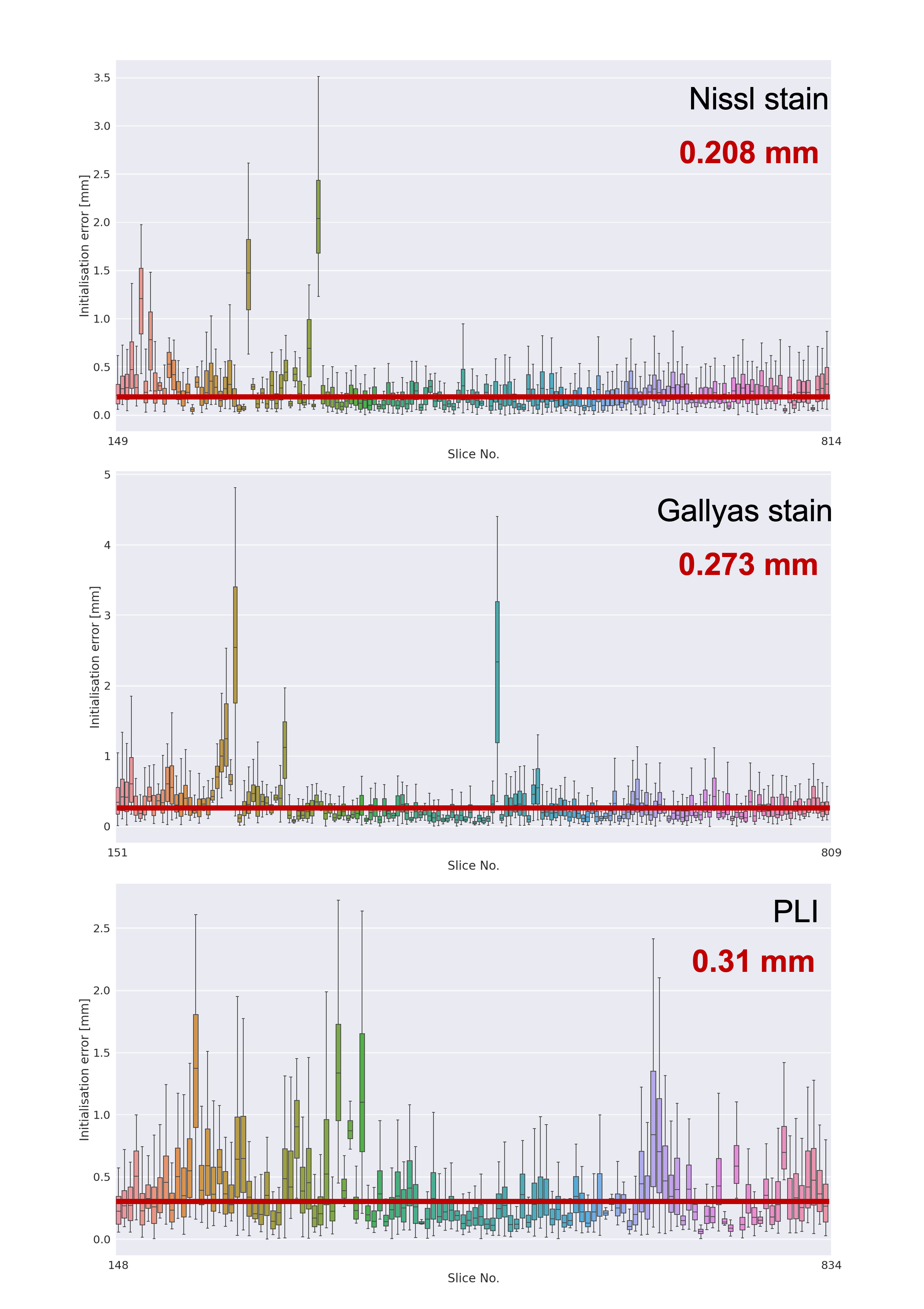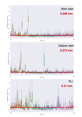Matching anatomical contours were observed on coronal slices after the MRI data was resampled onto the pre-registered microscopy image domains (Stage-1 result). A 3D visualisation after Stage 1 revealed that slight differences in the orientation of neighbouring slices resulted in consecutive slices intersecting or crossing over one-another, which is unrealistic.The additional constraints in stage 2 effectively eliminated the crossing slices and increased the accuracy of the registration. The output of stage 2 provides an estimate of the vector normal to the microscopy plane, which was found to be slightly off-coronal (with a 3.623° posterior and a 1.592° right rotation). The constraint for parallel slides was achieved without compromising in-plane anatomical correspondence on any of the slices. The empirical slice gap was found to be 51.7um, which is in strong agreement with the nominal value of 50um, and the final position of the slices seem to strictly adhere to this regular pattern of Nissl-Gallyas-PLI sections being acquired in order. The non-linear registration step in Stage 2 successfully addressed bulk deformations of the histology slide, as shown by the improved consistency of anatomical contours of the hippocampus on sagittal sections (Fig.3).Fig.4 shows full orthogonal sections of the 3D volumetric reconstructions. The self-consistency of the reconstructed anatomy, and the alignment of the grey-white matter contours in all viewing planes confirm the high-quality registration of all slices.Finally, our quantitative analysis in Fig.5 shows that on average, Stage-1 estimates of microscopy pixel positions were offset from their Stage 2 target in MRI space by 0.208mm for Nissl-stained slices, 0.273mm for Gallyas, and 0.310mm for PLI. This indicates the accuracy of registering stand-alone sections of histology by Stage 1Conclusion