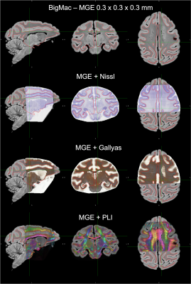 Combined MRI-microscopy datasets are increasingly in demand, as they can provide novel insight to the cellular-level constituents of MR contrasts, as well as ground truth for validating diffusion microstructural models of the brain. The BigMac dataset (Fig.1) [1-3] is a unique collection of in vivo MRI, high-quality postmortem MRI (structural, relaxometry and diffusion data) and multi-contrast microscopy in a single, whole macaque brain. The microscopy data acquired so far includes coronal sections of polarised light micrographs (PLI), and myelin- and Nissl-stained histology can shed light onto the complete cyto- and myeloarchitecture of the macaque brain. Here, we report the development of a high-performance image registration pipeline for the simultaneous alignment of multiple microscopy contrasts to post-mortem MRI in the BigMac dataset. Existing histology-MRI registration methods tend to rely on the reconstruction of a 3D stack of microscopy data by registering consecutive sections of a single modality to each other [4] or to a series of blockface photographs [5]. Our TIRL-based [6] pipeline computes direct microscopy-to-MRI transformations for each slice, which not only makes it straightforward to use with multi-modal microscopy data, but also to work with microscopy images at native resolution.Methods