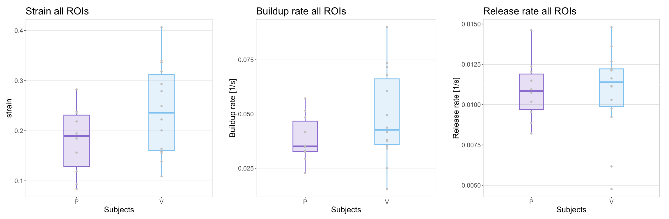 Some qualitatively different patterns could be found between patients and controls, as exemplified in Fig. 1, where a high-strain area appears during the contraction between the center of the two NMES electrodes. Over the whole triceps surae (Fig. 2), both the strain and the buildup rate showed a median increase between patients and healthy controls, with the strain having a median of 0.24 for controls and 0.19 for patients, and the buildup rate having a median of 0.042s-1 for controls and 0.035s-1 for patients. The release rate showed a smaller difference, with 0.0114s-1 for controls and 0.0108s-1 for patients. In all cases, the rank sum test did not reach significance, with the lowest p-value of 0.12 for the strain variable (95% confidence interval of the difference -0.02, 0.13). The disaggregated analysis of the three muscles showed a higher difference in strain and buildup rates in the soleus in comparison with the other muscles (Fig. 3).Discussion