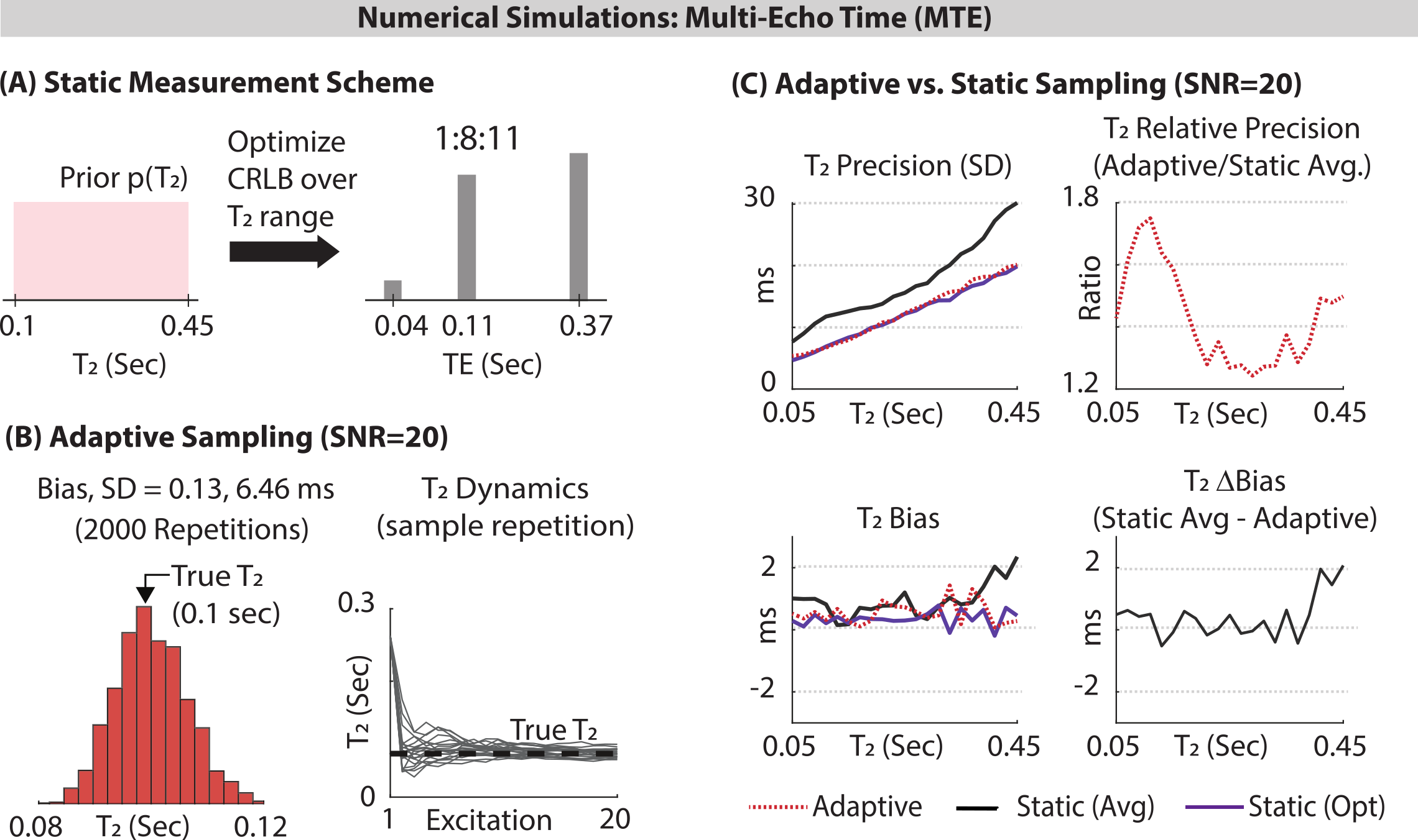 Simulations: Fig. 2C shows the absolute and relative bias of $$$T_2$$$ estimation for the adaptive and static approaches, as well as for an optimal approach in which the echo times were selected to minimize each $$$T_2$$$'s CRLB. Both approaches are unbiased, but the adaptive approach offers gains in precision from 1.2-1.8 (depending on $$$T_2$$$), and nearly matches the optimal approach.