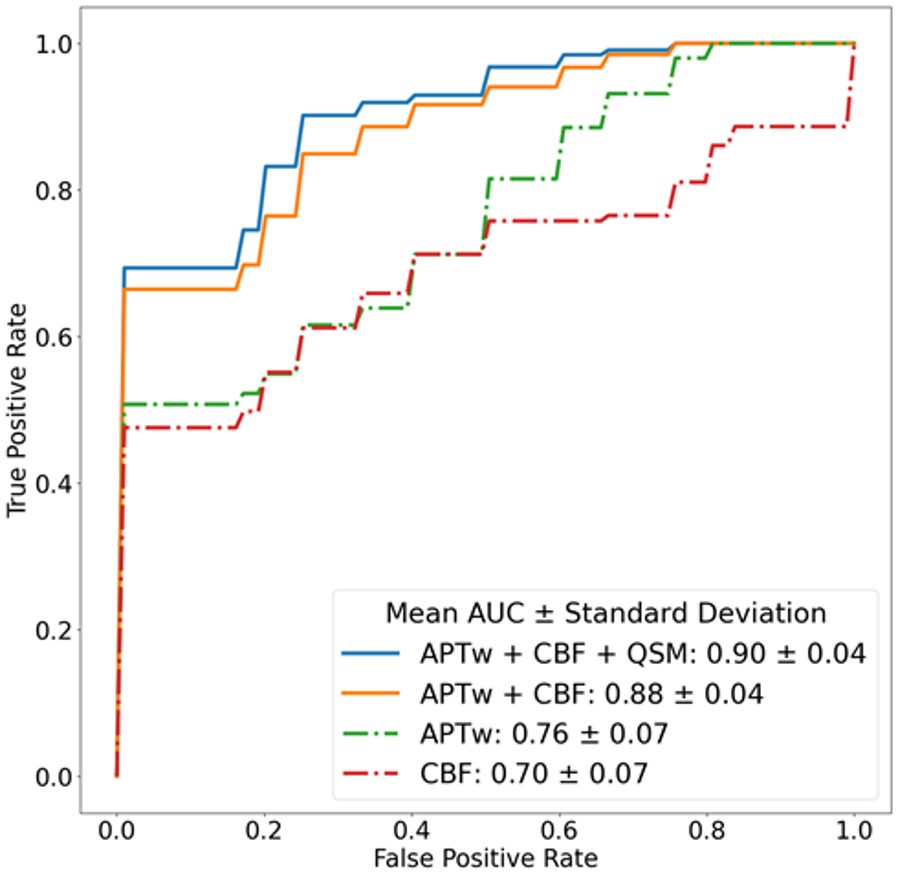 from APTw, CBF, and QSM achieved the highest classification performance, with a