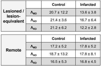 dependences of MD, AD, and RD for both control and infarcted groups in lesioned/lesion-equivalent