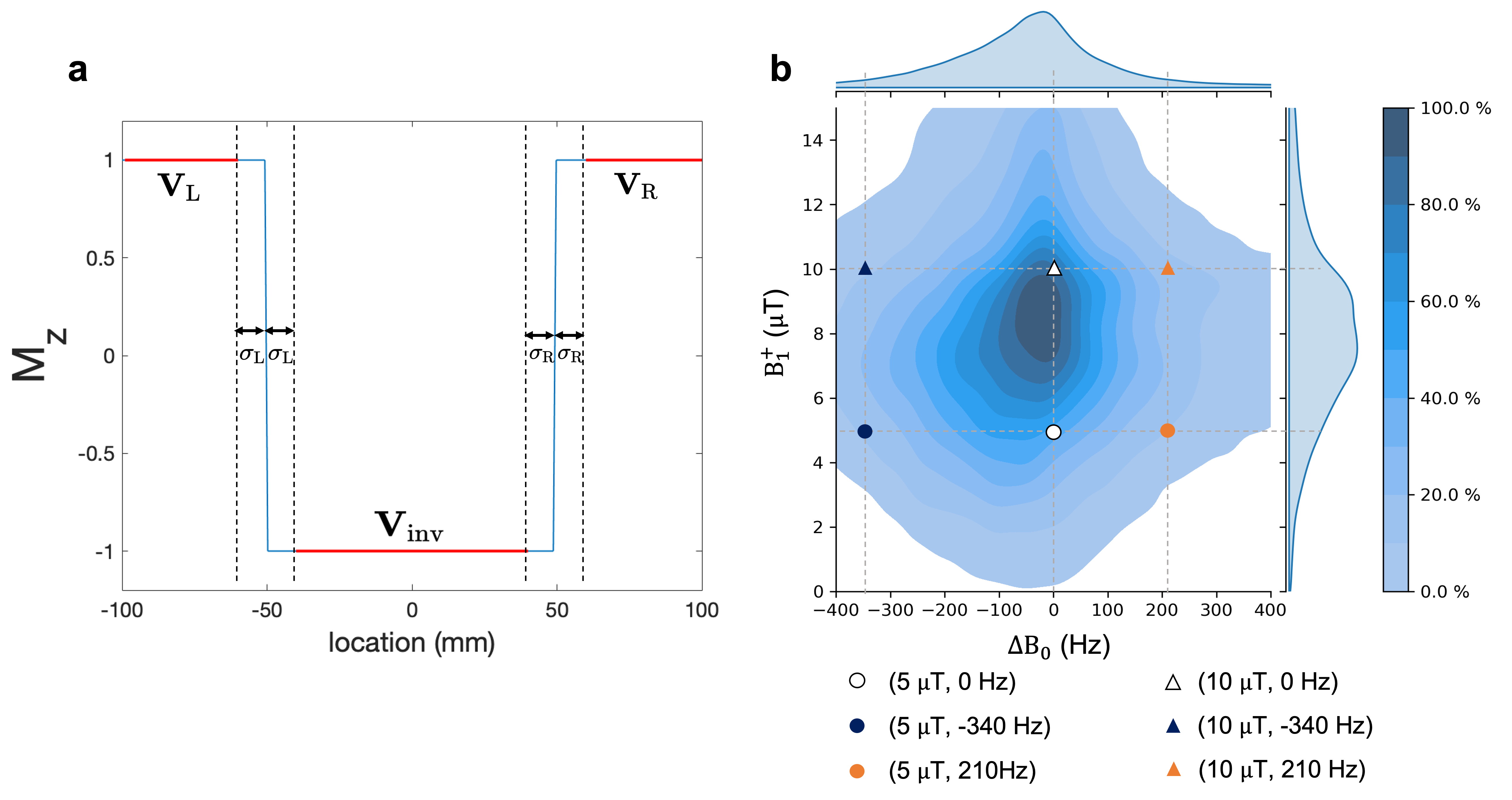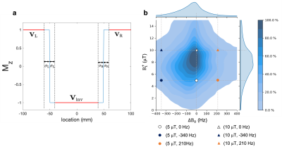 $$\mathcal{L}=\sum_{\Delta{B_0},B_1^+}\left(\mathcal{L}_\text{inv}+\lambda_1\mathcal{L}_\text{smooth} \right)+\lambda_2\mathcal{L}_\text{SAR},$$ where $$$L_\text{inv}$$$ is the MSE between the simulated and ideal inversion profiles over a width of $$$2\Delta x$$$ ($$$\Delta x$$$: desired inversion thickness) over three segments (Figure 1a); $$$L_\text{smooth}$$$ is the total variation of the simulated inversion profile; $$$L_\text{SAR} = \int_0^D F_1^2(t) dt$$$ penalises pulse energy. Realistic $$$\Delta{B_0}$$$ and $$$B_1^+$$$ conditions were selected at the 10th percentile contour of the joint ($$$\Delta{B_0}$$$,$$$B_1^+$$$) histogram (Figure 1b) based on co-registered $$$\Delta{B_0}$$$ and $$$B_1^+$$$ maps of four healthy volunteers.