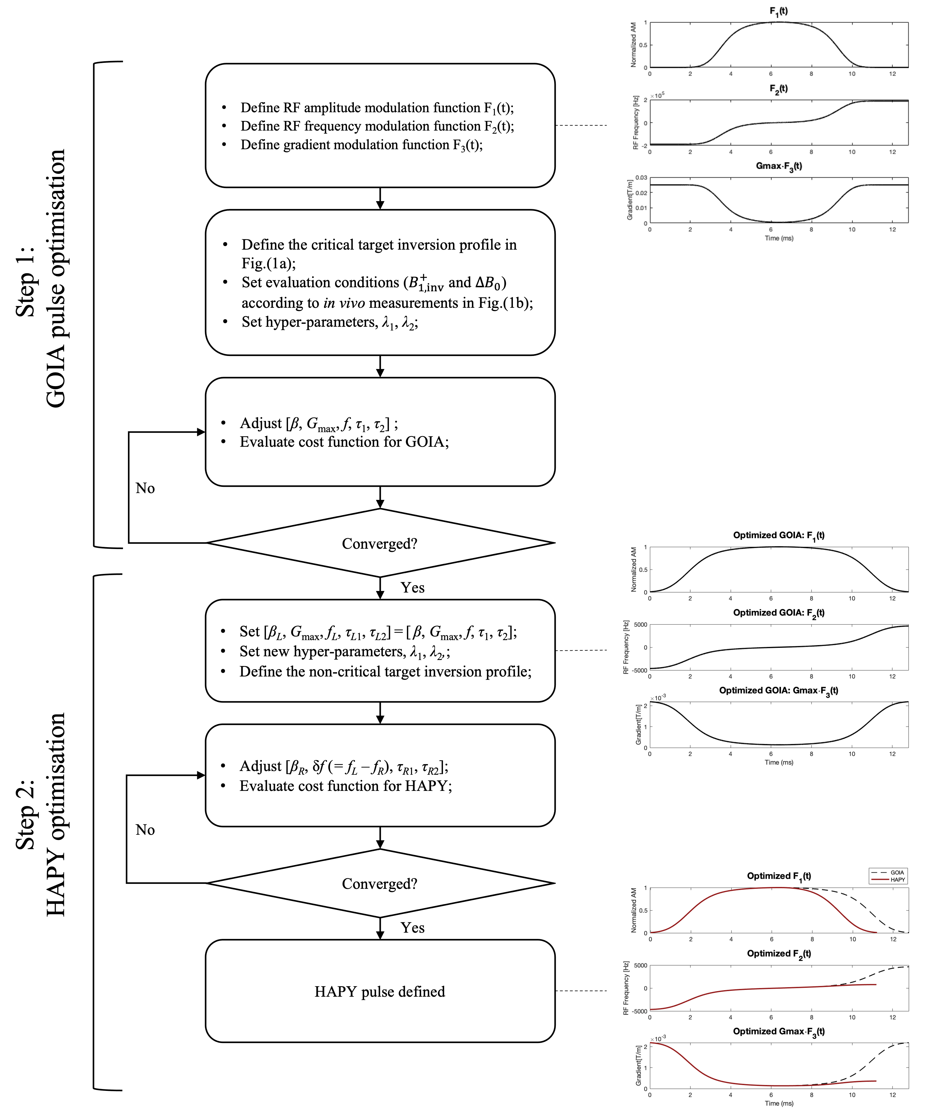 A two-step optimisation process was performed by firstly optimising the base GOIA pulse with sharp transition, which was subsequently used as the critical side of HAPY, and secondly optimising the non-critical side of HAPY with wider transition edge but greatly reduced energy (Figure 2).