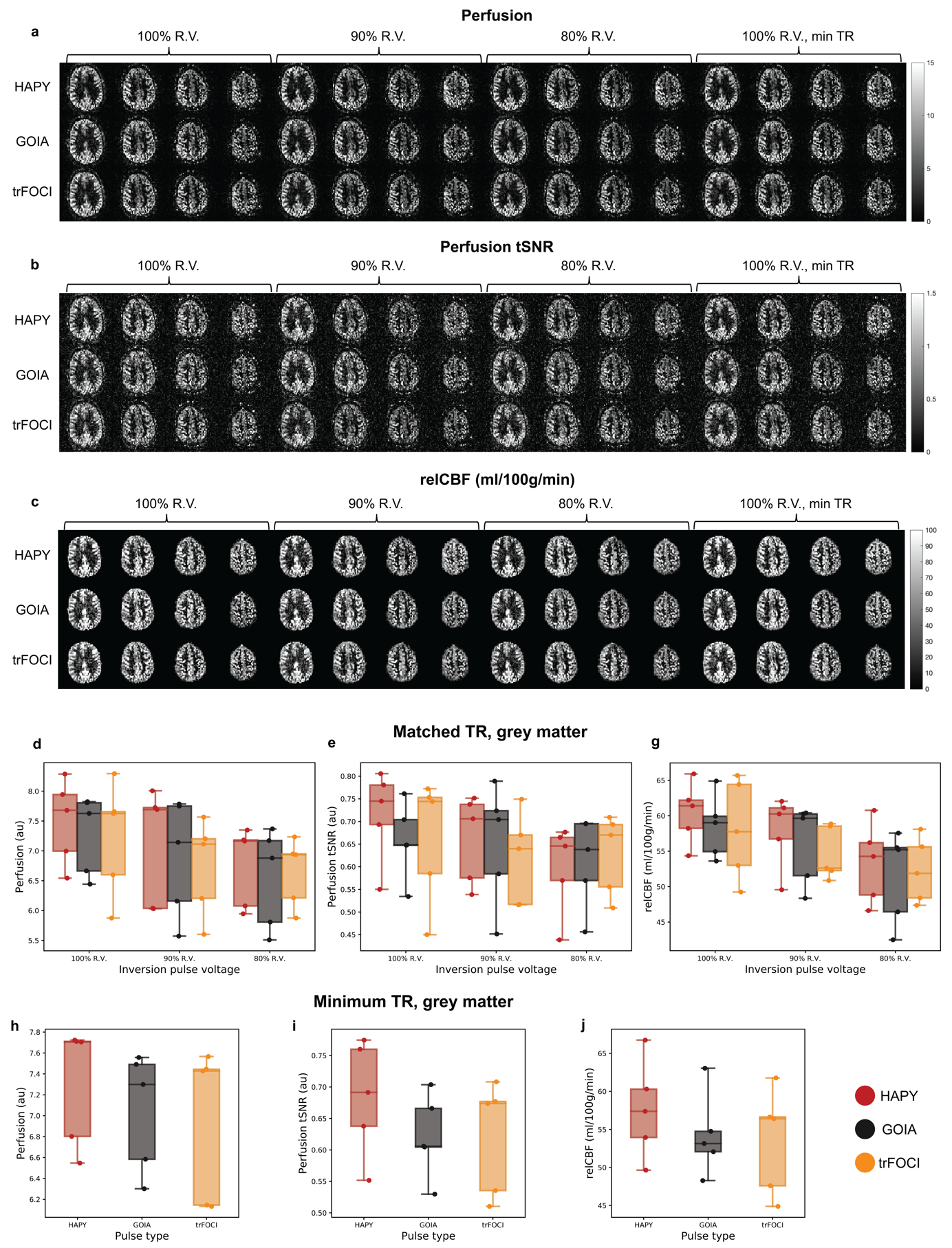 Results from in vivo scans showed no visually obvious (Figure 4a-c) or statistically significant (Figure 4d-g) difference between the perfusion results by HAPY and those by GOIA/trFOCI pulses at all three voltage levels, indicating that HAPY achieved SAR reduction without affecting the labelling efficiency. Thanks to its lower RF energy deposition, HAPY-PASL was able to achieve the highest temporal resolution within the same SAR limit, compared to GOIA and trFOCI pulses (Fig. 4h-j).Conclusion