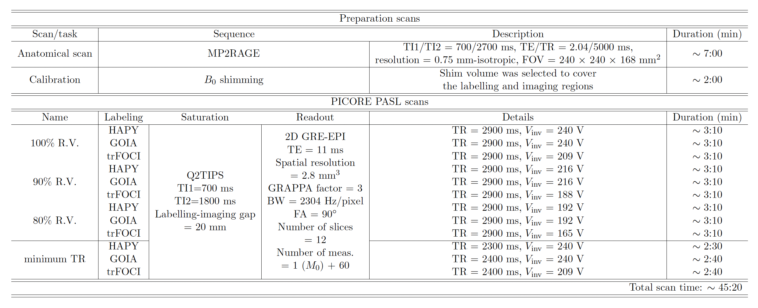 Phantom and in vivo scans were performed on an investigational 7T whole-body MRI scanner (MAGNETOM 7T plus, Siemens Healthcare, Erlangen, Germany) using a 1Tx-32Rx head coil (Nova Medical Inc., Wilmington, MA, USA). Inversion profiles of GOIA, HAPY, trFOCI, and HS-3 pulses were compared using a phantom experiment; a custom IR-FLASH sequence with inversion applied along the read-out direction was employed (resolution=2 mm2, TI/TE/TR=500/4.8/2000 ms, FOV=192 mm2 ). The same conditions were applied as in the simulation. In vivo perfusion data were acquired from five healthy volunteers (3M, 26.8$$$\pm$$$2.4 years old), using a custom PICORE-PASL sequence16 (protocol details summarised in Table 1). Average perfusion signal, perfusion tSNR, and relative CBF were calculated to compare the performance of HAPY, GOIA, and trFOCI as PASL labelling pulses. Results and discussion