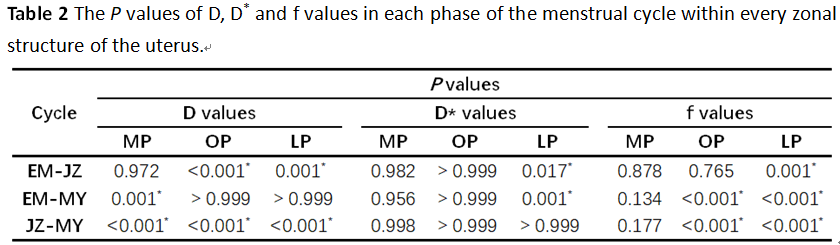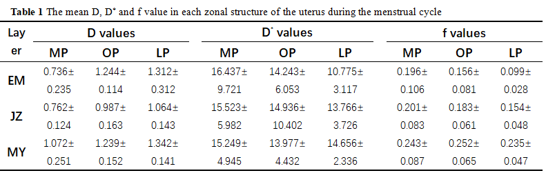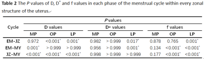 each uterine zone during menstrual cycle are listed in Table 1. The D values of