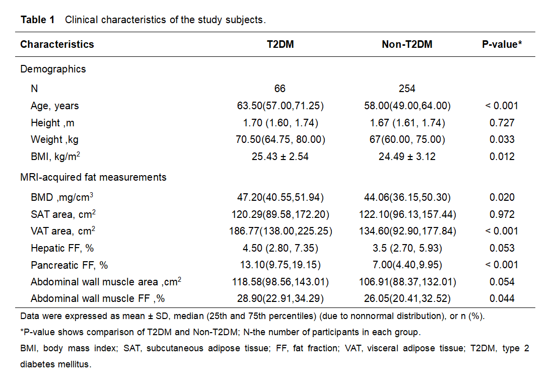 A total of 320 subjects with median age of 59 years were enrolled in the study,which included 66 patients with T2DM and 254 patients without diabetes. Visceral adipose tissue (VAT) area , subcutaneous adipose tissue (SAT) area , abdominal wall muscule area and fat fraction (FF) at the L1–L2 levels, hepatic FF, pancreatic FF were assessed by MRI FF maps. Statistical analysis was done using SPSS (Version 25.0 ,SPSS Inc., IL)and GraphPad Prism (Version 8.4.0, GraphPad software, LLC). The Shapiro–Wilk test was used to test the normality of the variables in overall subjects. Normally distributed data were expressed as means ± standard deviations, and nonnormally distributed data were expressed as medians and ranges. The statistical significance between means was calculated by t-test, analysis of variance or Mann-Whitney U test when appropriate. The correlations between abdominal fat, vertebral density and ectopic fat deposition variables were analyzed with the Pearson correlation test for normally distributed variables and Spearman correlation test for non-normally distributed data. Results