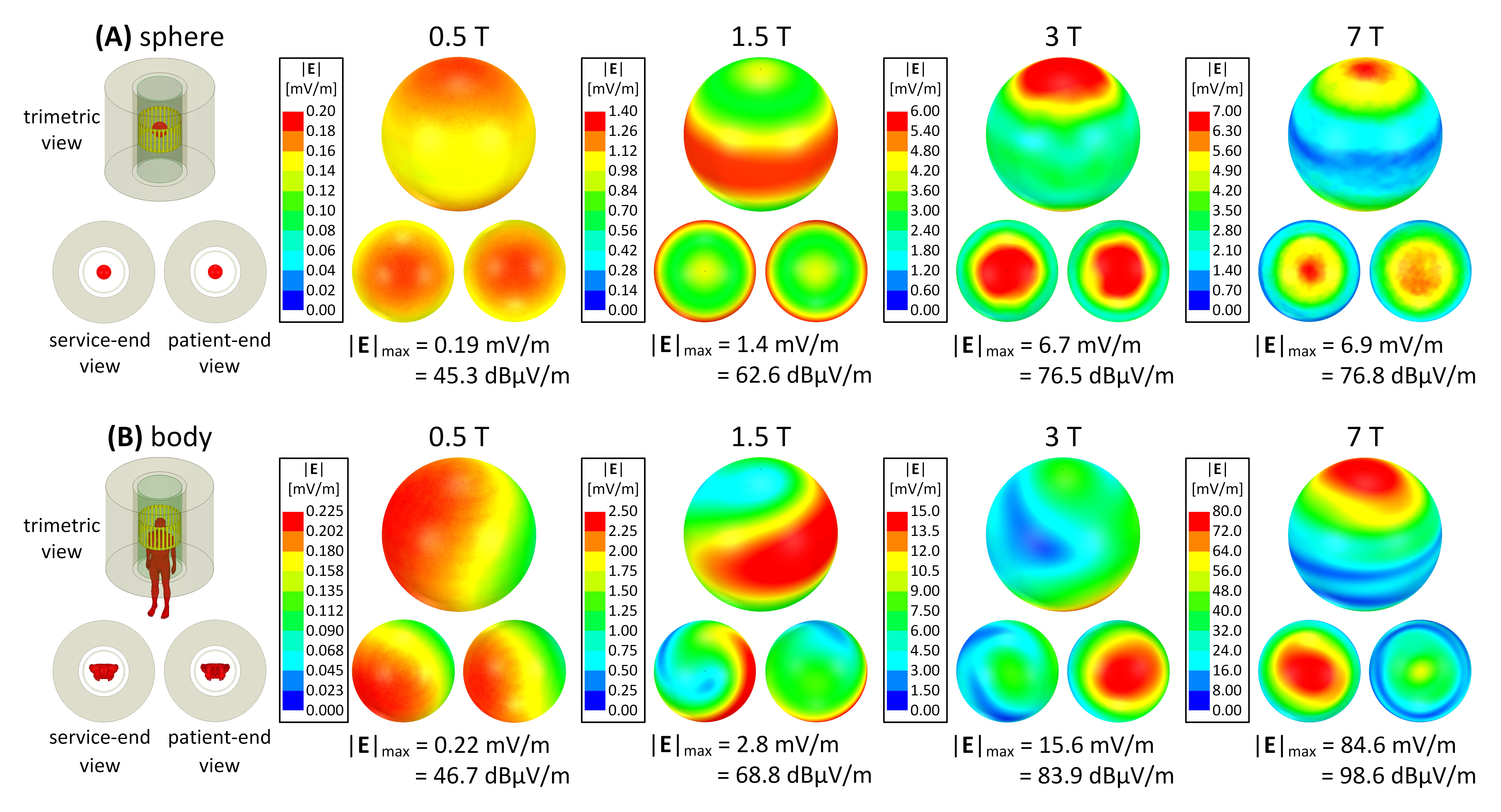 radiated power and maximum |E|-field for the 0.5T, 1.5T, 3T, and 7T MRI systems loaded