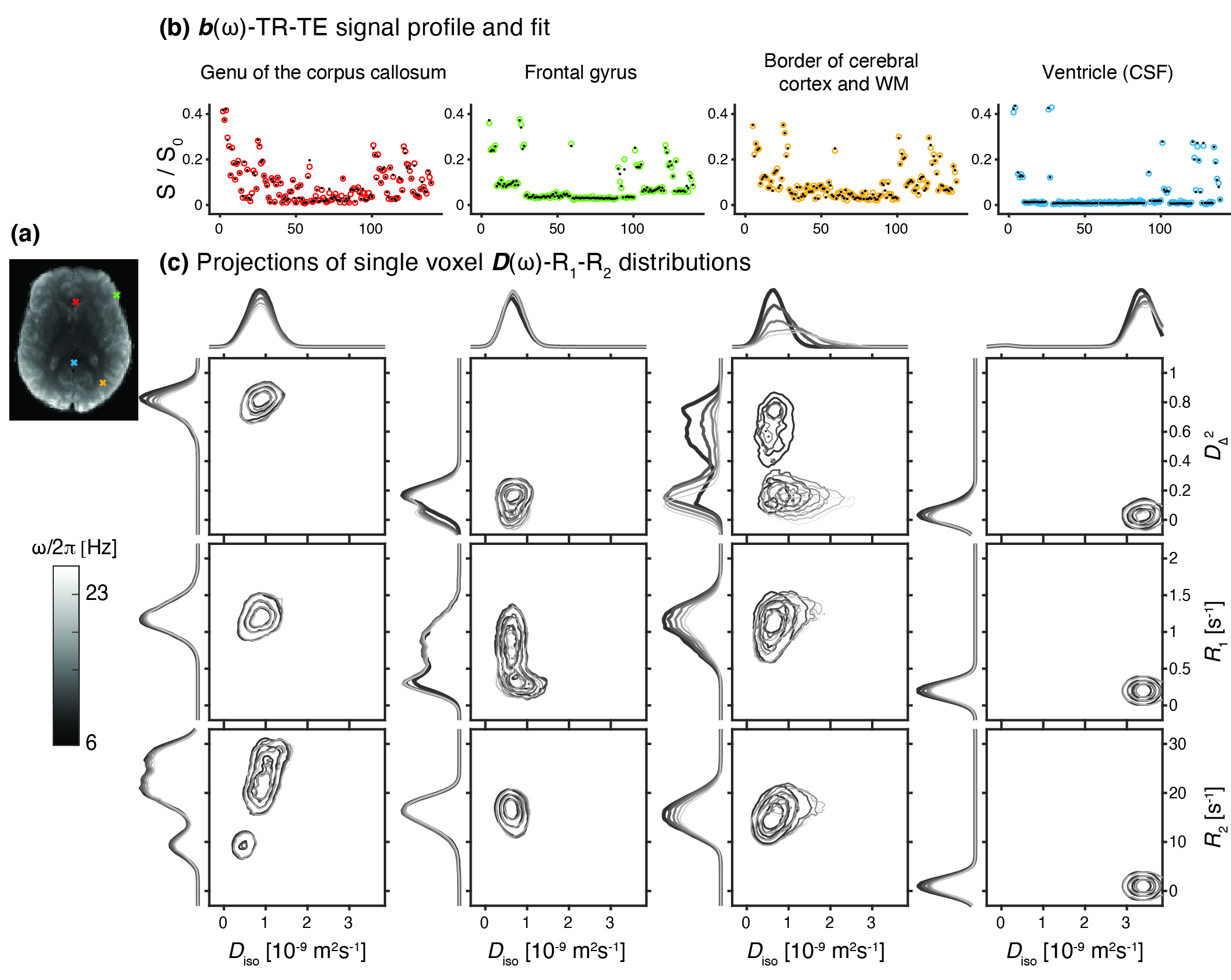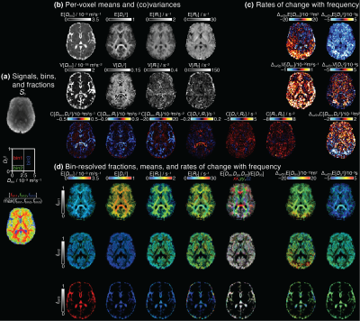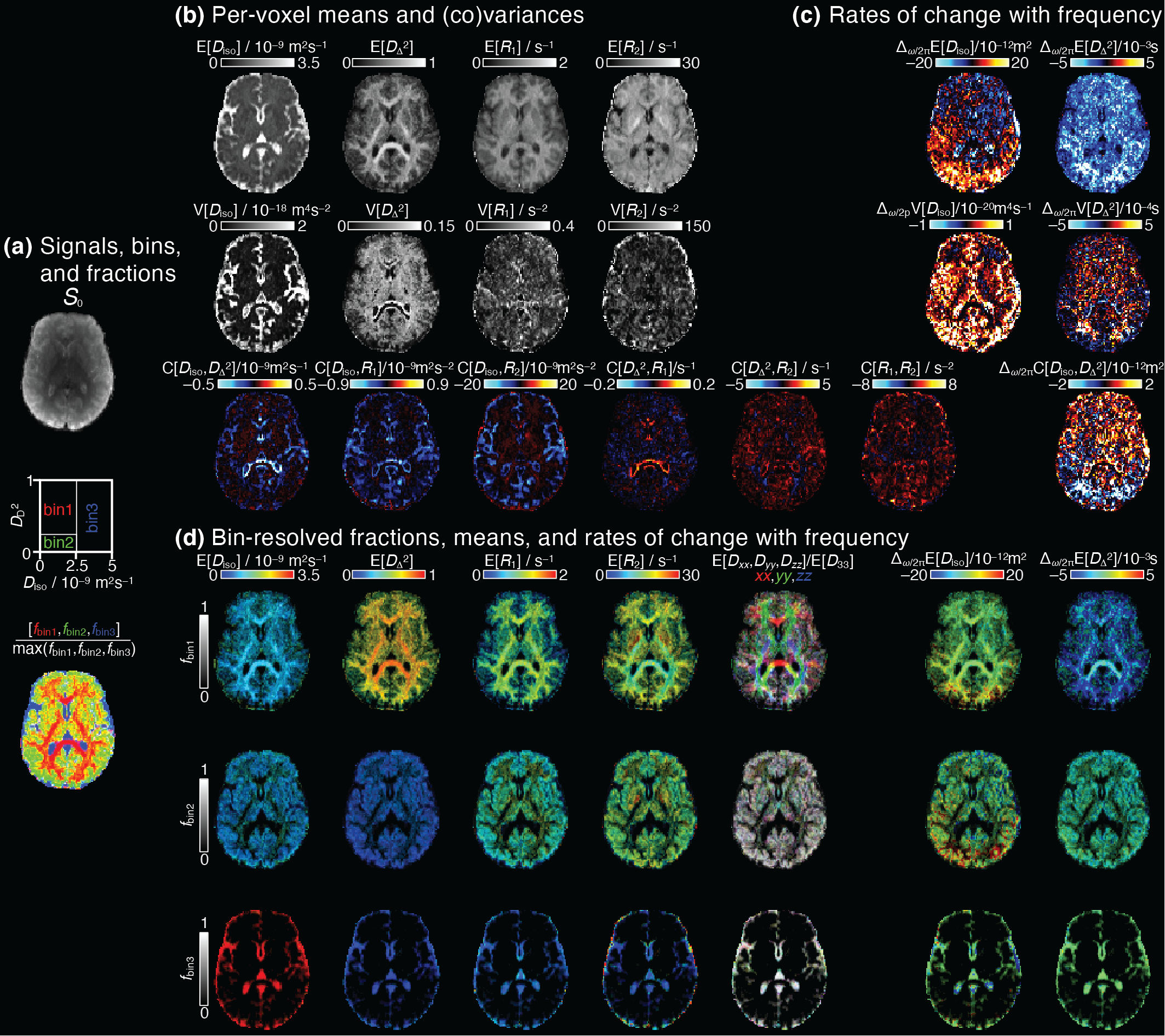 Figure 3. Parameter maps derived from voxelwise D(ω)-R1-R2 distributions. (a) S0 map displayed in gray scale, diagram with the division of the 2D Diso-DΔ2 projection into three bins (bin1,bin2,bin3), and the resulting signal fractions (fbin1,fbin2,fbin3) coded into RGB color. (b) Per-voxel means E[x], variances V[x], and covariances C[x,y] at frequency 6.5Hz. (c) Parameter maps of the rate of change with frequency, Δω/2π. (d) Bin-resolved maps of E[x] and Δω/2πE[x]. The brightness and color scales represent, respectively, the signal fractions and the values of each parameter.