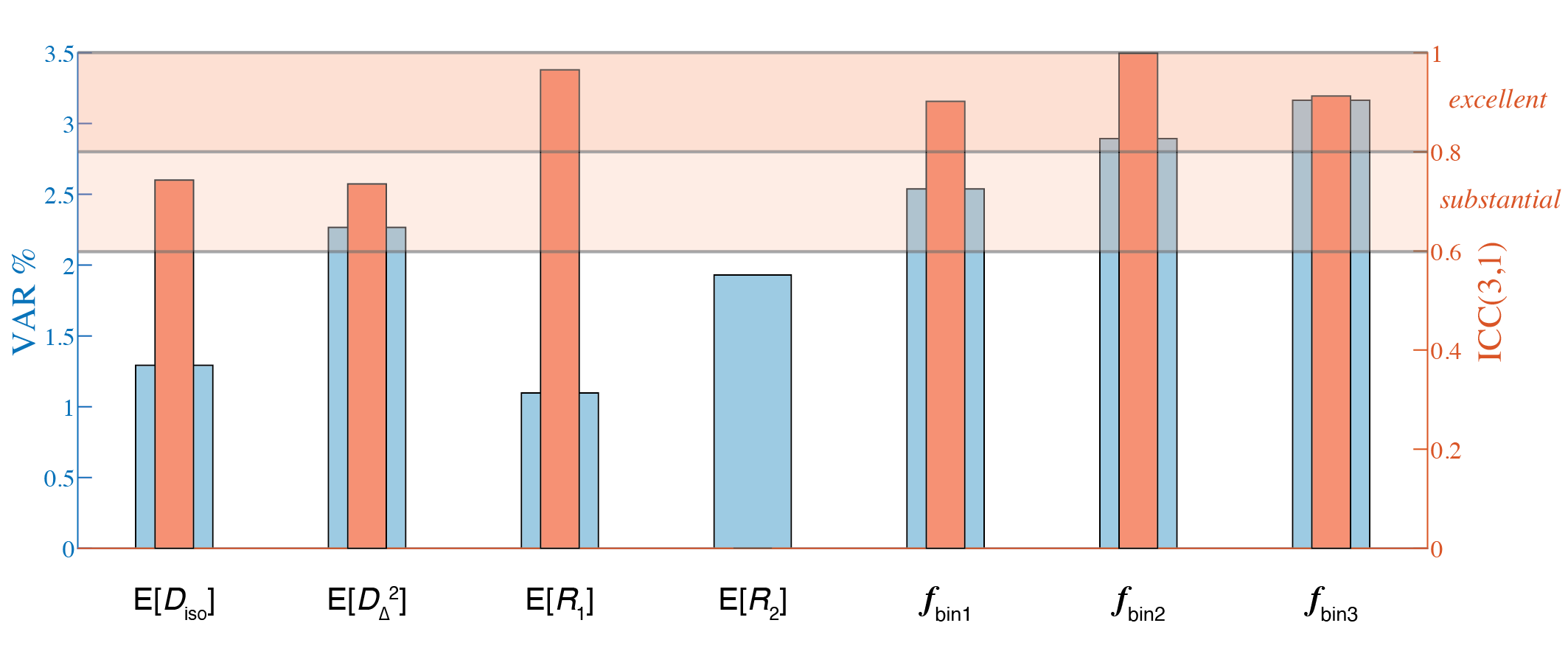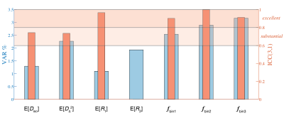 Figure 5. Test-retest variability (VAR) and repeatability (ICC(3,1)) calculated from a subset of three participants with repeat visits. Whole-brain averages were used, and VAR and ICC(3,1) are shown for seven parametric maps: E[Diso], E[DΔ2], E[R1], E[R2], fbin1, fbin2, and fbin3. E[R2] yielded negative ICC, which is theoretically difficult to interpret, and therefore was set to zero.