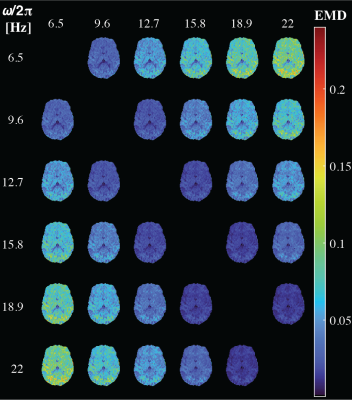 Using an integrative acquisition and processing pipeline that joins concepts from oscillating gradients, tensor-valued encoding, and diffusion-relaxation correlation, we comprehensively explored microstructure and local chemical composition in the human brain. Using both frequency-dependent and tensorial aspects of the encoding spectrum b(ω), we designed an in vivo, whole brain, 40-min 7D D(ω)-R1-R2 distribution acquisition protocol at 2mm isotropic resolution. Scanning eleven healthy participants, we demonstrated frequency/time-dependent changes of diffusion-relaxation correlations measures in the human brain. Finally, intra-scan test–retest repeatability of a range of reconstructed parametric maps was investigated.