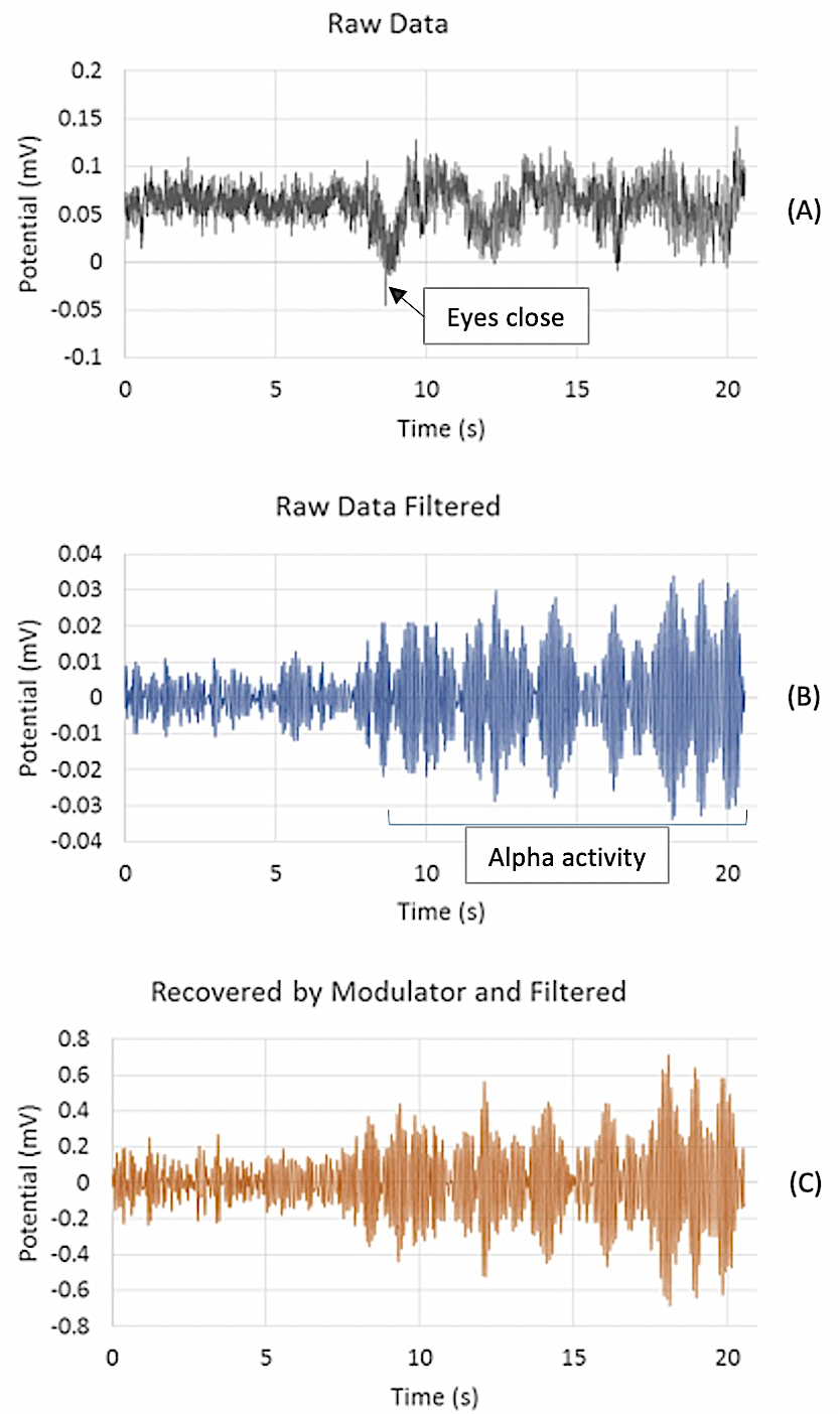 TM technology, a high impedance device that can pick up signals without the need for "wet" contact with the skin. The minimum resolvable voltage of the modulator was ~ 12.5 uV, sufficient for most EEG waves.
