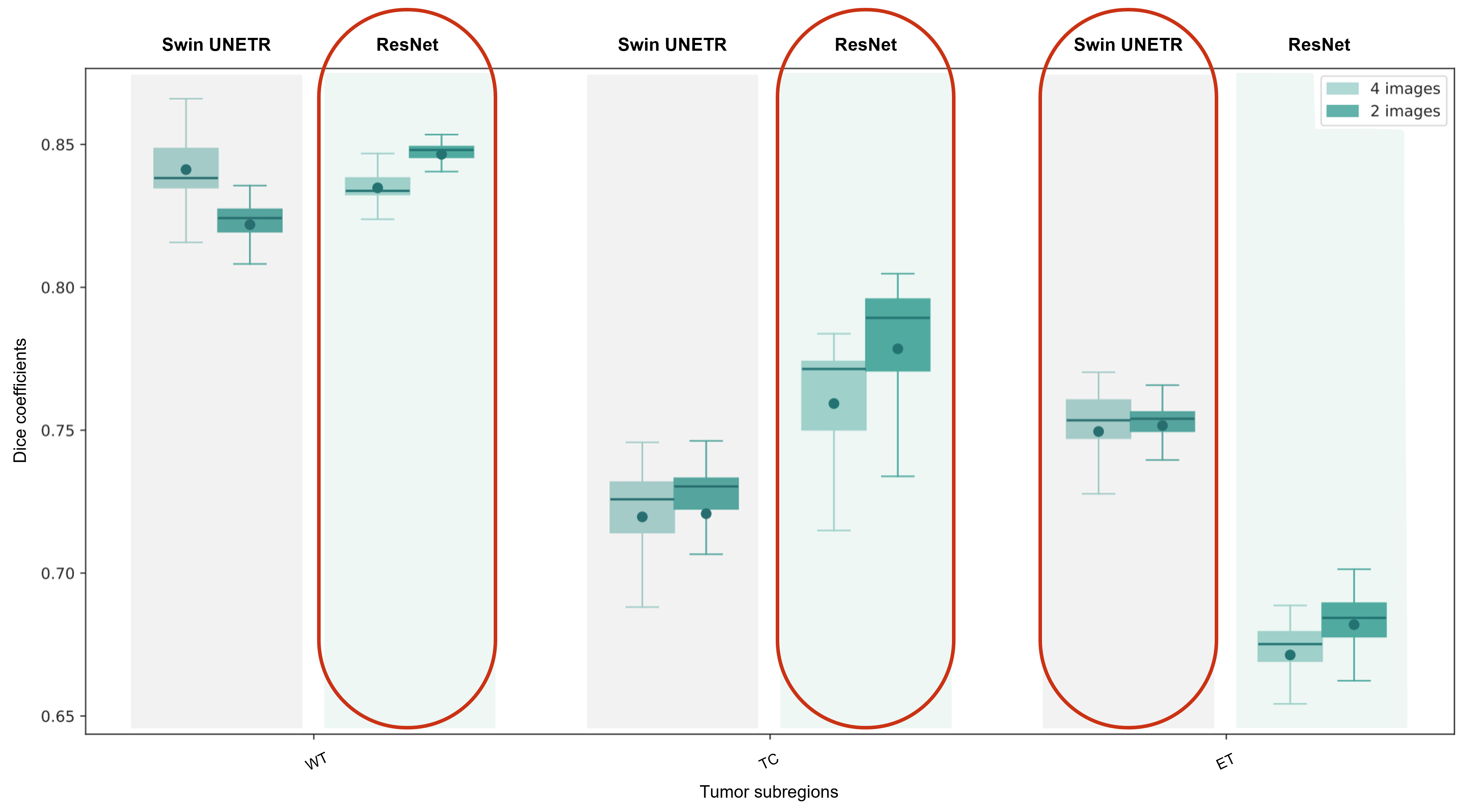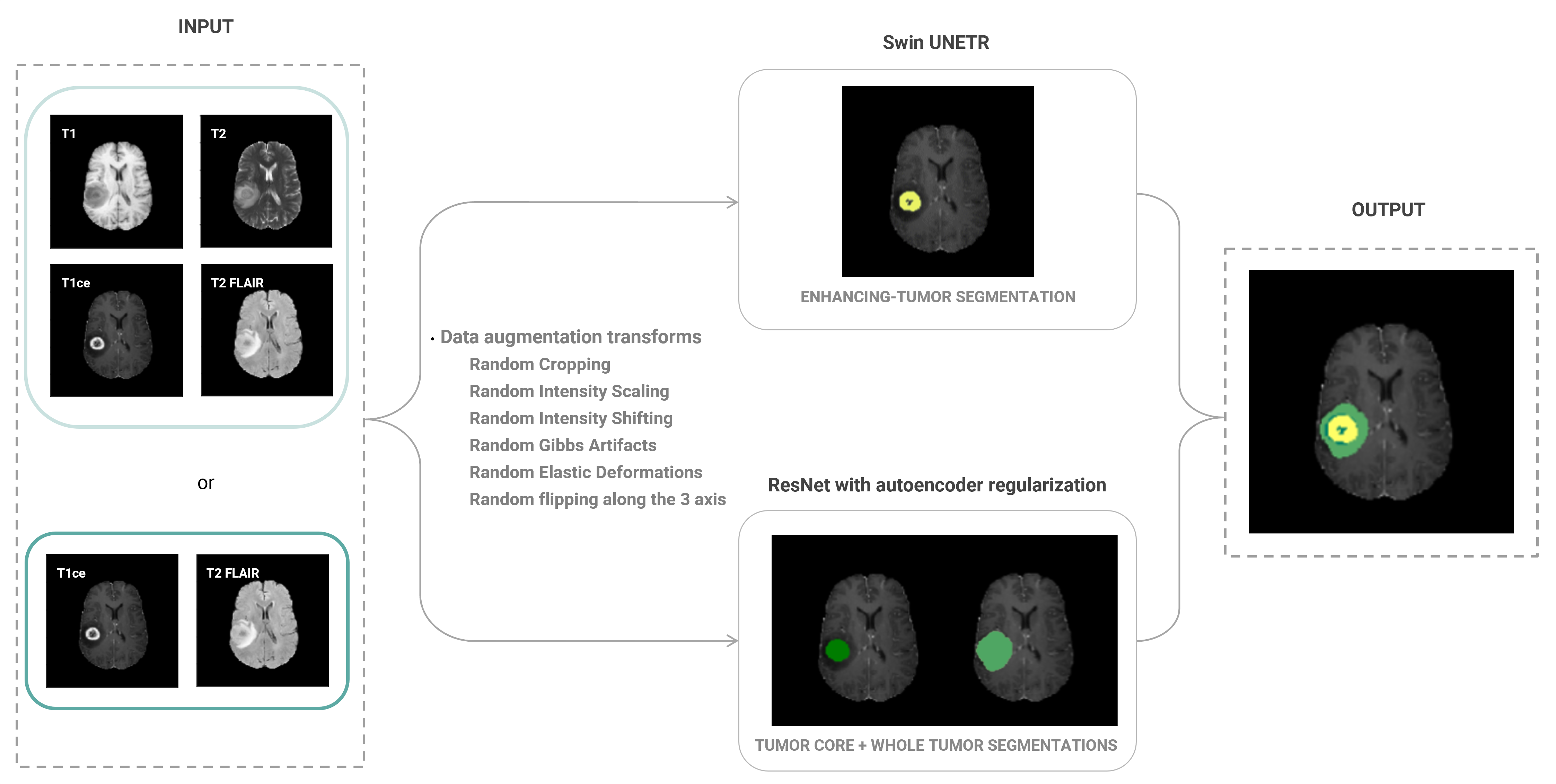 The BraTS 2021 challenge dataset was divided into subsets of 60%, 20% and 20% for training, validation and testing, respectively. We tested the performance of two network architectures for brain tumour segmentation implemented in the Medical Open Network for Artificial Intelligence (MONAI)5, a Pytorch-based open-source framework for deep learning in healthcare imaging: 1) a ResNet-based architecture using autoencoder regularisation6; 2) Swin UNEt TRansfomers (Swin UNETR), a U-shaped network that uses a Swin transformer as the encoder and a CNN-based decoder7. After normalising the signal intensity of the MRI scans and applying data augmentation transforms, the model was trained using: i) all four modalities; and ii) only two modalities. In both cases, three nested subregions were considered: Tumour Core (TC), Enhancing Tumour (ET) and the Whole Tumour (WT), including edema. Considering prior reports on the performance of each network for the different subregions, we used an ensemble model that combines the WT and TC grading from the ResNet architecture and the ET classification from the Swin UNETR (Figure 1), due to the higher accuracy of the Swin transformers in classifying smaller regions8, such as the ET. Model accuracy was assessed using the Dice coefficient of each segmented region with the respective manual segmentation labels from the BraTS dataset.Results