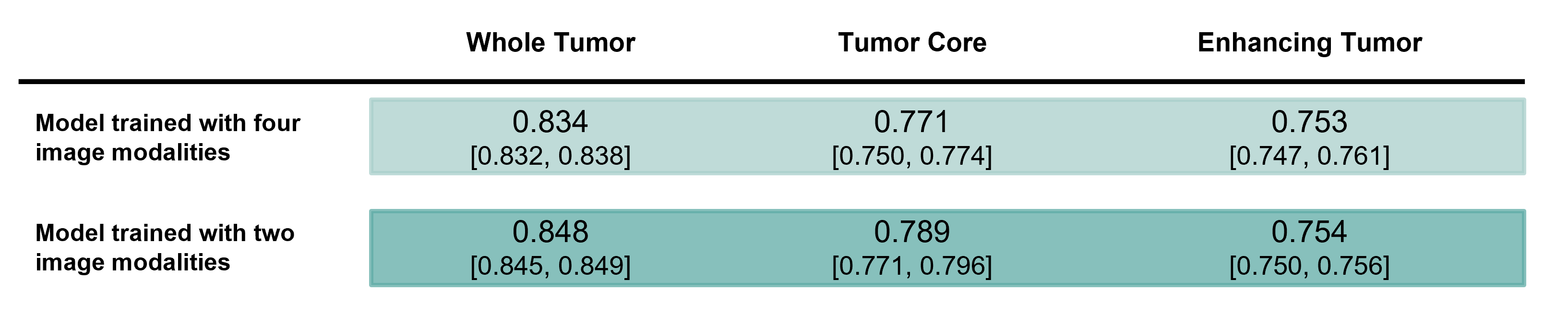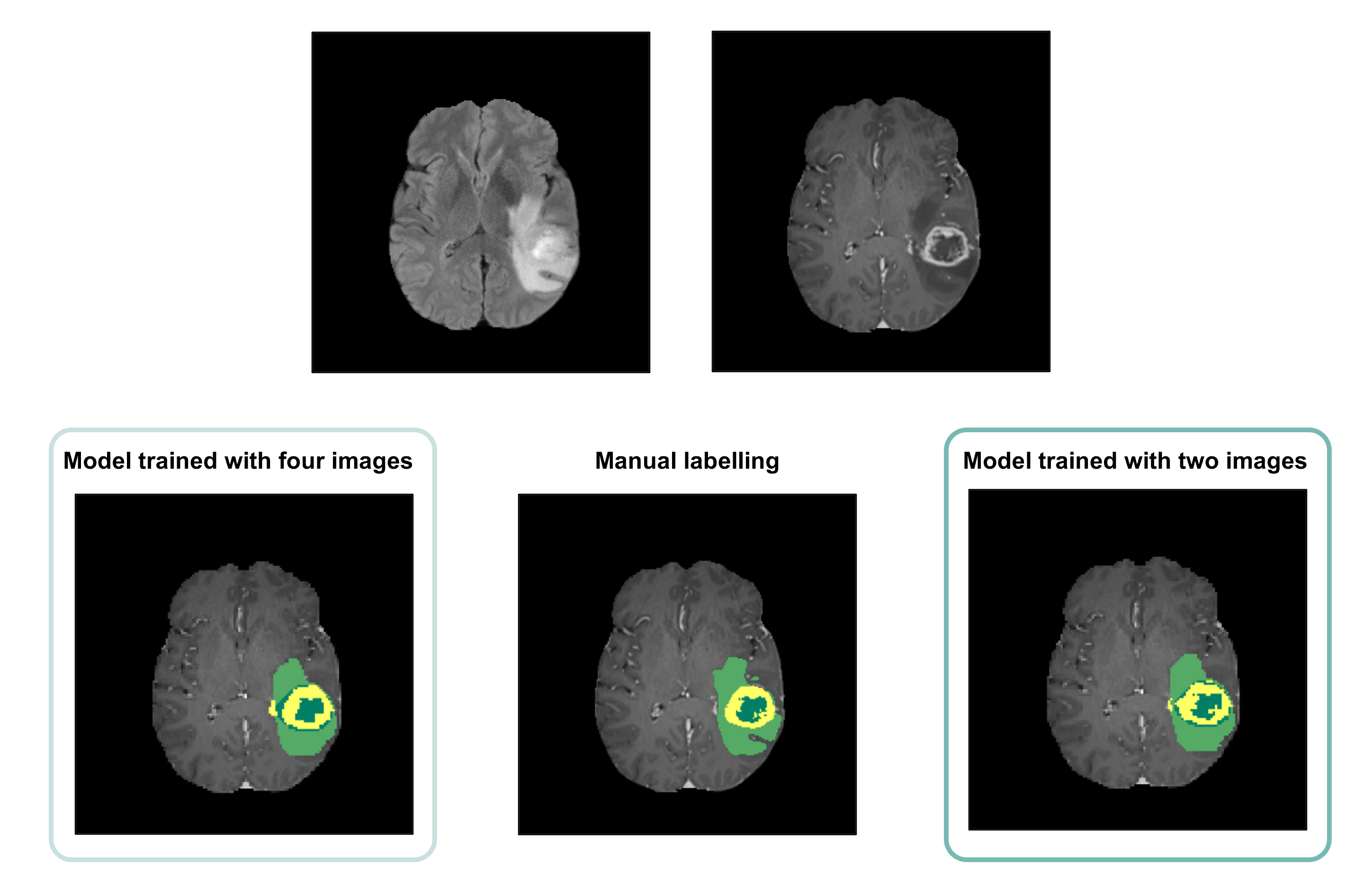 The same deep learning model was trained for automated segmentation of glioblastoma tumour regions using either four or two MRI modalities. The performance of the model trained with only two images was found to be comparable to that of the longer protocol, suggesting that the excluded images and the consequent longer training time did not contribute significantly to the accuracy of the model. These findings strongly imply that this training approach may be beneficial for clinical applications, as it would result in reduced costs due to shorter scanner times, lower computational requirements and increased patient throughput, without compromising segmentation accuracy.