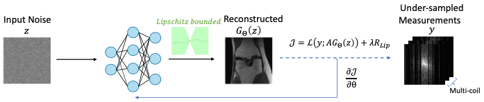 $$ J(Θ,C)=L(y;AG_θ (z))+λ\prod_{i=1}^l softplus(c_i)$$, where $$$C = \{c_i\}$$$ is the set of per-layer Lipschitz constants that are learned jointly with the network weights $$$\Theta$$$. The softplus function prevents infeasible negative Lipschitz bounds. y denotes the under-sampled measurements, and A denotes the measurement model, which includes an under-sampling mask, Fourier Transform, and coil sensitivity maps (optional). $$$G_{\theta}(z)$$$ is the parameterization of the reconstructed image via a convolutional neural network that takes a fixed random noise vector as input, following the DIP framework. An overview of our method is shown in Fig 1.