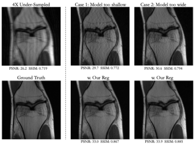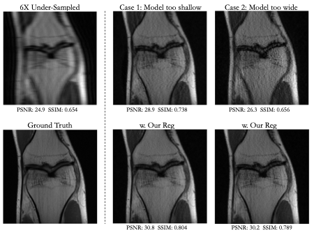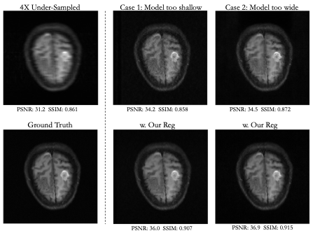 This work investigated the influences of architectural choices on unsupervised MRI reconstruction with the deep image prior framework, and proposed a novel regularization strategy to substantially improve the reconstruction without tedious architectural design. Future work will be focused on extensive hyper-parameter tuning for more effective network regularization to improve performance under more aggressive acceleration factors.Acknowledgements