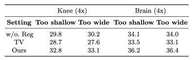 Visual and numerical results for the multi-coil knee and brain datasets under 4x and 6x acceleration are shown in Figs. 2-5 and Tab. 1. We tested U-Net architectures with typical widths (128 vs. 256 channels) and depths (3 levels vs. 5 levels). Additional results for total-variation (TV) regularized DIP [7] are shown in Tab 1. Figs. 2-5 indicate that suboptimal architectures lead to severe artifacts in the reconstructed images (top rows). Utilizing our regularization strategy, we observe appreciable improvements in image quality over the baselines, especially for 4x acceleration. Notably, the extent of improvement is similar regardless of the architecture. This suggests that controlling the frequency biases of the network architecture via proper regularization might be as effective as modifying the architecture in DIP based reconstruction. In contrast, TV regularization does not exhibit comparable performance. Our strategy works consistently on MR images acquired from different organs (i.e., knee and brain).Discussion