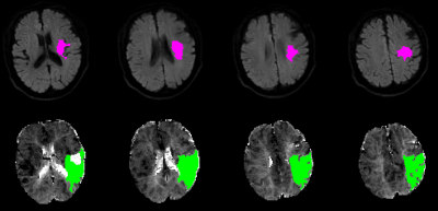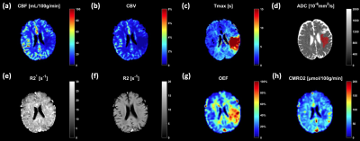 Mq-BOLD relies on the analytical tissue model proposed by Yablonskiy and Haacke in 19942. The estimates of the transverse relaxation rates R2*=1/T2* and R2=1/T2 as well as the relative cerebral blood volume (rCBV), which directly determine the OEF value, are based on three separate measurements3,4. R2 maps were calculated from the even echoes relaxometry data to reduce stimulated echoes5. R2* maps were generated using the two echoes for each STAGE scan, then averaged6. DSC perfusion weighted imaging (PWI) analysis was followed the mature processes to calculate time-to-maximum (Tmax), relative cerebral blood flow (rCBF), and leakage corrected rCBV7. The perfusion parameters rCBF and rCBV values were then normalized to 50 mL/100g/min and 2.5% in a small region of non-hypoperfusion gray matter, respectively8. The oxygen extraction fraction was then calculated using:$$OEF=\frac{R_{2}^{*}-R_{2}}{\frac{4}{3}\cdot rCBV\cdot\pi\cdot\gamma\cdot\bigtriangleup\chi _{0}\cdot Hct\cdot B_{0} }$$where the introduced parameters are assumed to be constant ($$$\bigtriangleup\chi _{0}=0.246\times 10^{-6} $$$, $$$Hct=0.35$$$, $$$\gamma=2.675\times10^{8}s^{-1}T^{-1}$$$, $$$B_{0}=3T$$$)4. The CMRO2 maps were generated using the equation: CMRO2=CaO2×OEF×rCBF, where CaO2=8.68 μmol/mL is the arterial oxygen content. The apparent diffusion coefficient (ADC) map was used to predict the ischemic core (ADC<620×10-6mm2/s) and a threshold of Tmax greater than 6 seconds was used to define the hypoperfused tissue10 (Fig.1). The penumbra was identified by PWI-DWI mismatch regions.Results