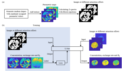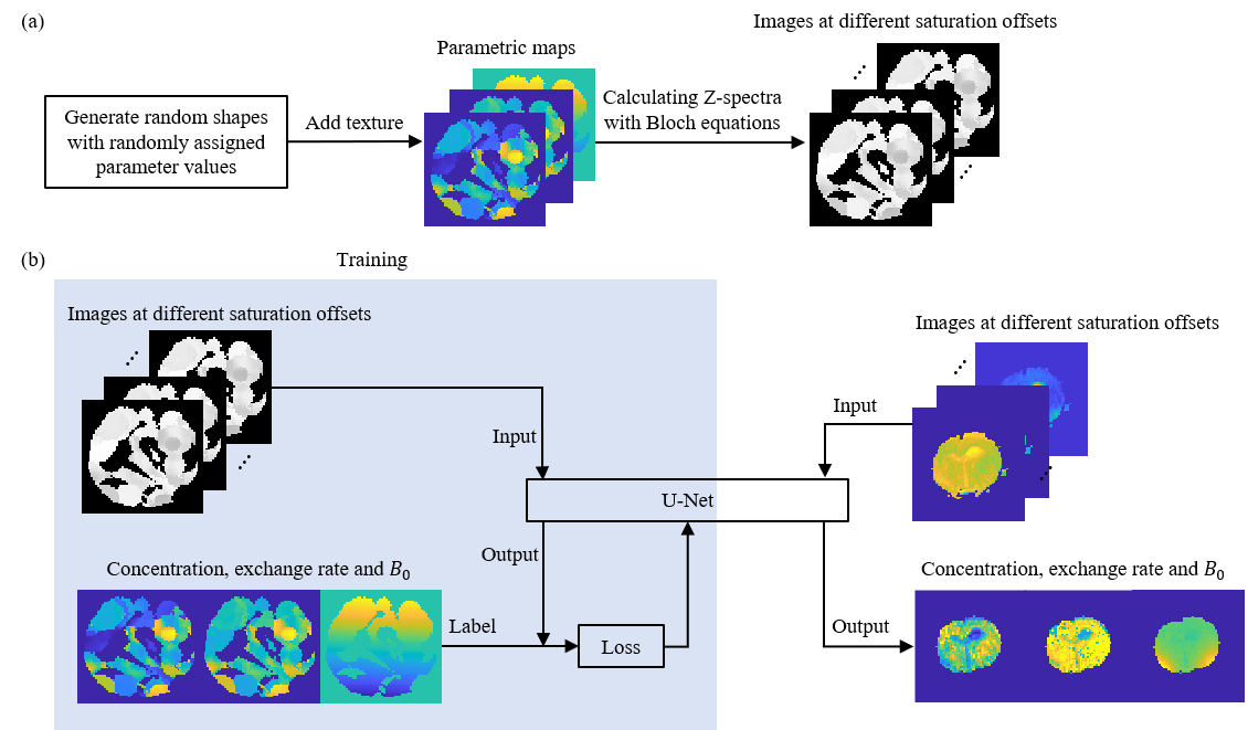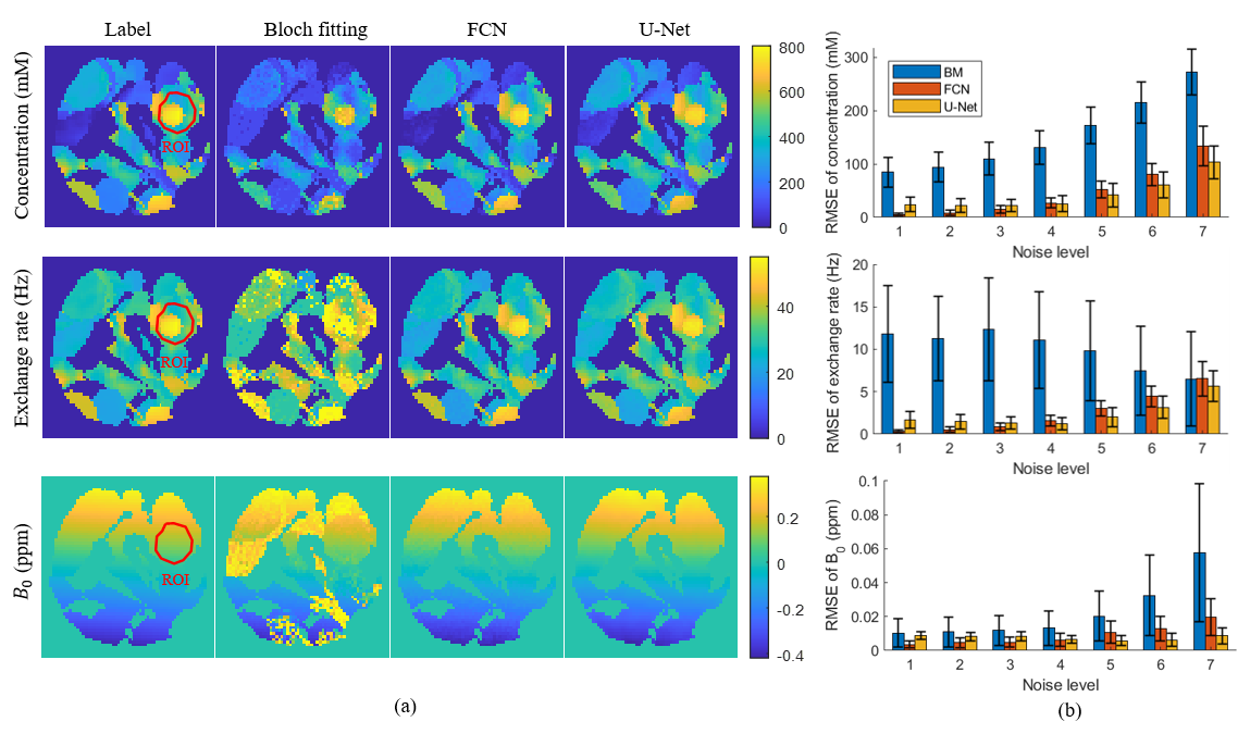 Quantitative experiments: Bloch fitting4, FCN5 and U-Net were used to obtain NOE concentration and exchange rate, and B0 maps for comparison. The Bloch equations were applied to simulate the Z-spectra for each pixel with MATLAB. Figure 1b shows a U-Net used to quantify parametric maps. Different from FCN, which is a pixel-wise network, the input of the U-Net is the images at different saturation frequency offsets instead of pixels of Z-spectra. The output of U-Net is the NOE’s concentration and exchange rate, and B0 maps.