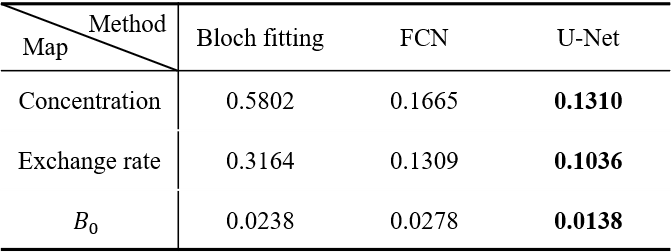 The results of three methods for the simulation sample with noise level 4 are displayed in Figure 2a. Figure 2b shows that in the case of strong noise (noise level > 4), the RMSEs of U-Net results are smaller than those of Bloch fitting and FCN, which indicates that U-Net has the highest accuracy in strong noise.