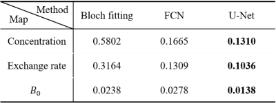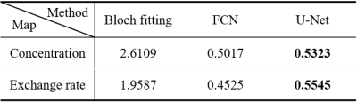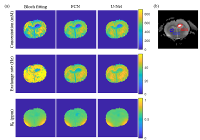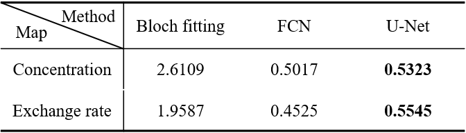 For a set of 64 × 64 rat brain data, Bloch fitting took about 20 h, FCN took about 5 s, while U-Net took less than 1 s. Figure 3a shows the results of rat brain. In the NOE concentration map, the tumor portion shows a lower concentration than normal tissue, which is coincident with established studies.1, 3 Figure 3b shows the ROIs for CV and CNR calculations. Table 1 indicates that the CVs of ROI1 in tumor from U-Net are significantly lower compared with Bloch fitting or FCN. Table 2 shows that the CNRs from U-Net are higher than those of FCN. These results indicate that U-Net has higher precision and provides more visible contrast between tumor and normal tissue than FCN.Discussion and conclusion