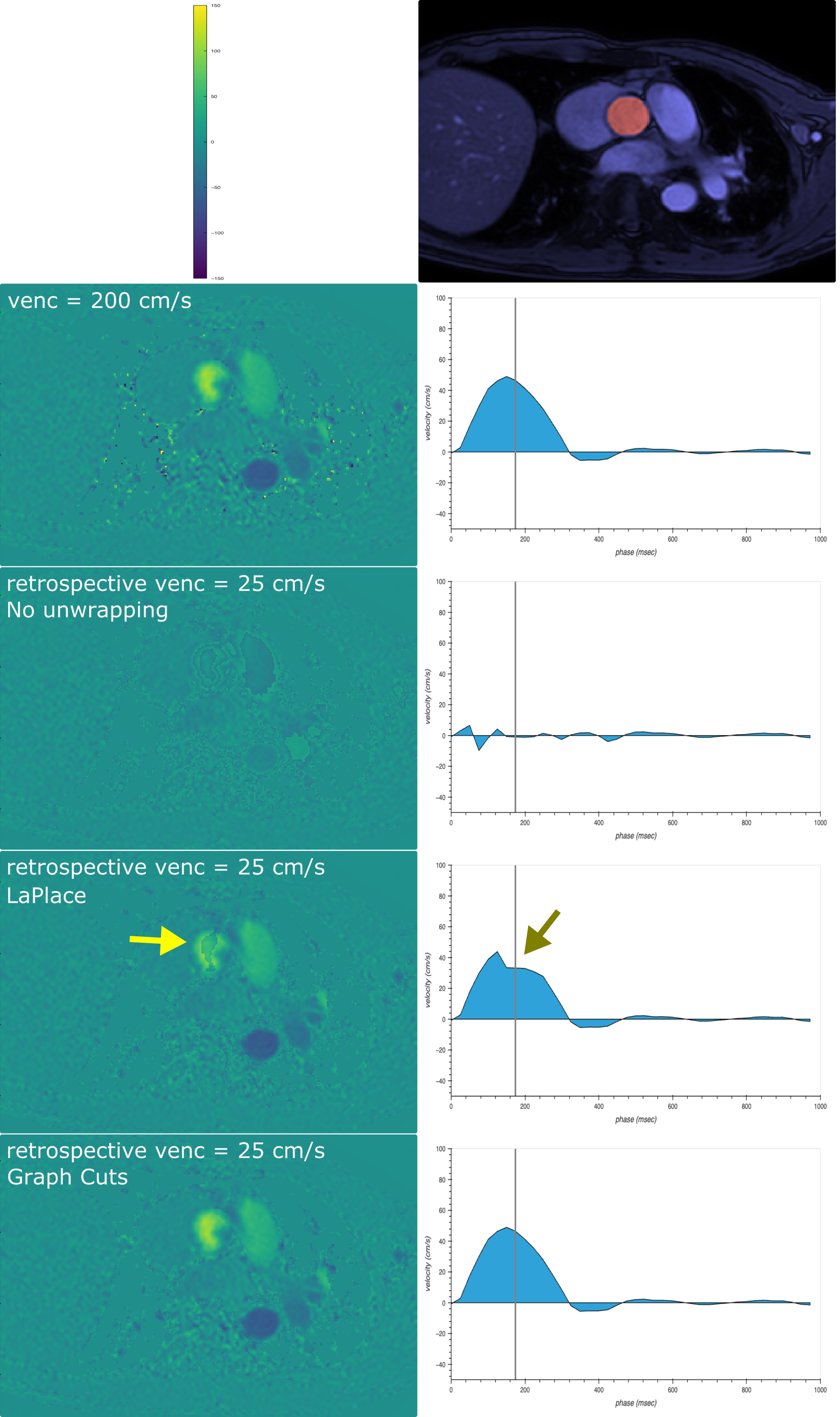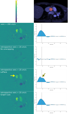 Phase-contrast cine MRI is commonly used in cardiovascular examinations for the assessment of flow in the great vessels. Since the velocity encoding range ± venc is mapped onto the phase-contrast image, velocities outside this range will be subject to phase wrapping. Nonetheless, it is desirable to keep venc low since it is inversely proportional to the velocity-to-noise ratio1. Therefore, venc is typically set to the expected maximum velocity plus a safety margin for each patient. This procedure adds complexity to the examination and requires retakes if the maximum velocity is underestimated. As an alternative, acquisition with venc below the maximum velocity may be combined with phase-unwrapping, provided reliable algorithms are available2. In this work, we explore phase-unwrapping using graph-cuts, which have previously been successfully applied for fat/water separation3.Methods