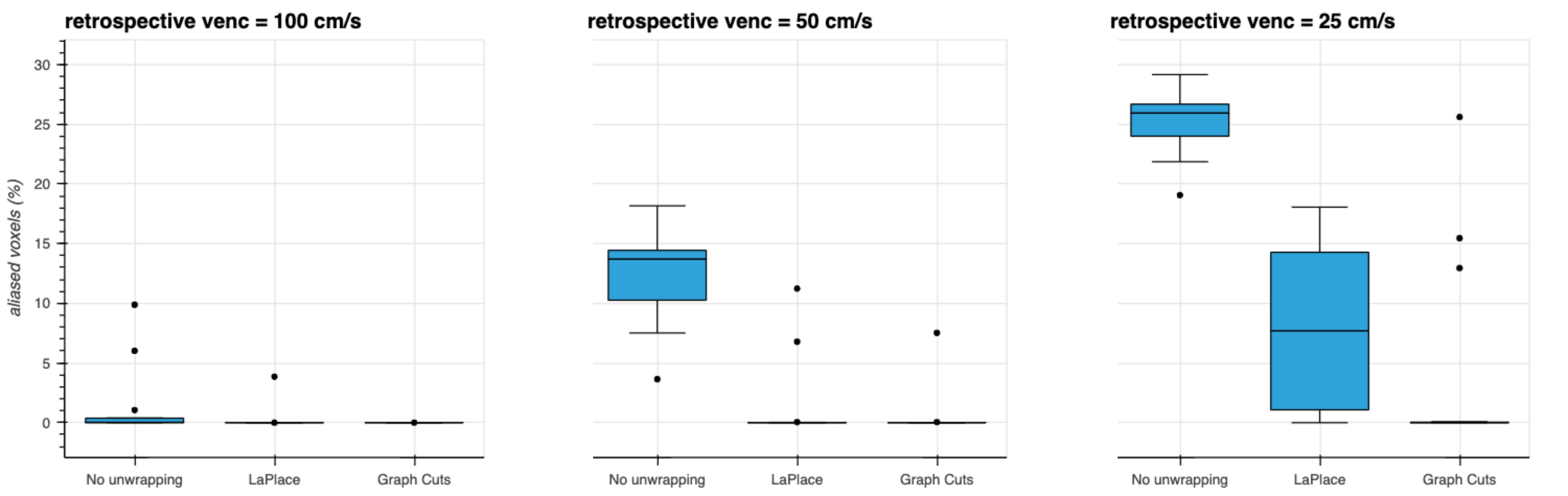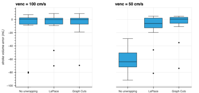 No phase wrapping was seen in the high-venc acquisitions. Most mid-venc acquisitions showed only limited phase wrapping, while all low-venc acquisitions demonstrated severe phase wrapping. Box plots of the stroke volume error for mid- and low-venc compared to high-venc acquisition are shown in Fig. 1. The average stroke volume error for No unwrapping / LaPlace / Graph-Cuts was -11.0 / -7.9 / -6.0 mL for venc=100 cm/s and -61.4 / -11.8 / -7.4 mL for venc=50 cm/s.