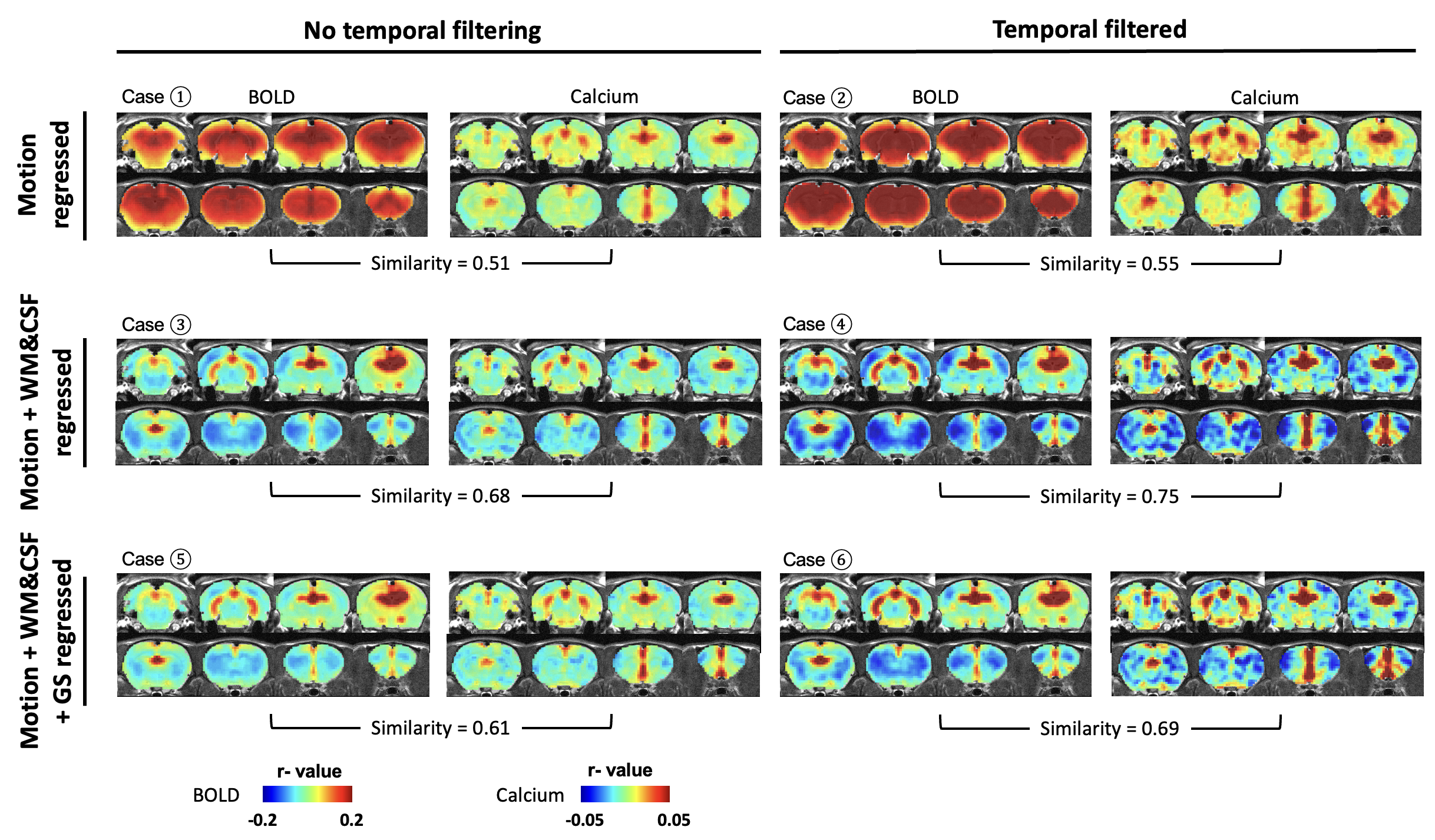 We next assessed the efficacy of different preprocessing steps on rsfMRI data. Our calcium-derived seed maps demonstrated high consistency across different steps (Figure 5), suggesting that calcium signal was insensitive to non-neural artifacts and can provide reliable measurements of neuronal activity. In contrast, BOLD-derived seed maps were highly sensitive to different processing steps. White matter/cerebrospinal fluid (WM/CSF) and/or global signal regression significantly improved the spatial specificity in BOLD-derived seed maps. Temporal filtering (TF) did not affect the spatial specificity but increased contrast-noise ratio. By comparing spatial similarity, Case 4 (motion, WM&CSF regression + TF) provides more optimal performance to rsfMRI data preprocessing. Discussion