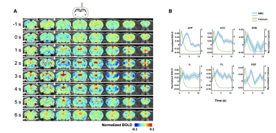The fMRI and calcium photometry data were first temporally aligned (Figure 2). A python-based pipeline was used for calcium signal preprocessing19. A MATLAB-based pipeline was used for fMRI data preprocessing20-23. The calcium-predicted BOLD signal was generated by convolving the calcium signal with a hemodynamic response function (HRF) characteristic to rats10. More details of methods can be found in our publication24. Results