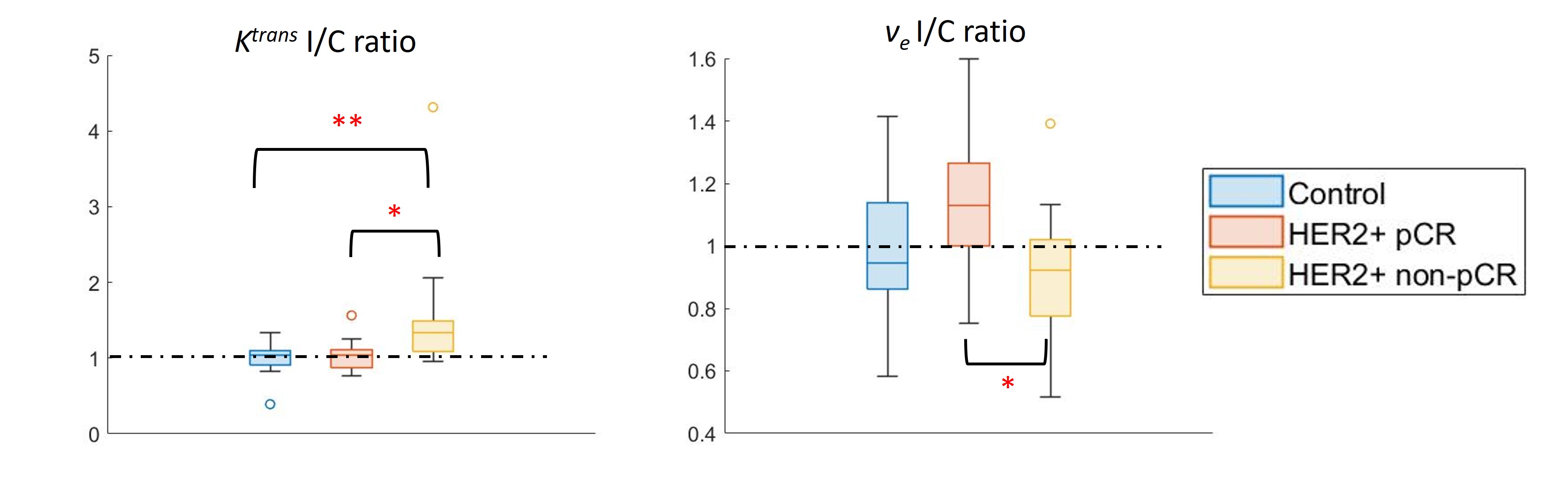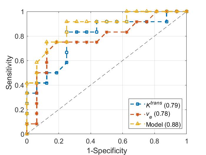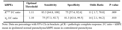 the two kBPEs used to predict pCR. I/C ratio of $$$K^{trans}$$$ more than 1.11 and I/C ratio of $$$v_e$$$ less than 1.10 were associated with pCR. The area under the receiver operating