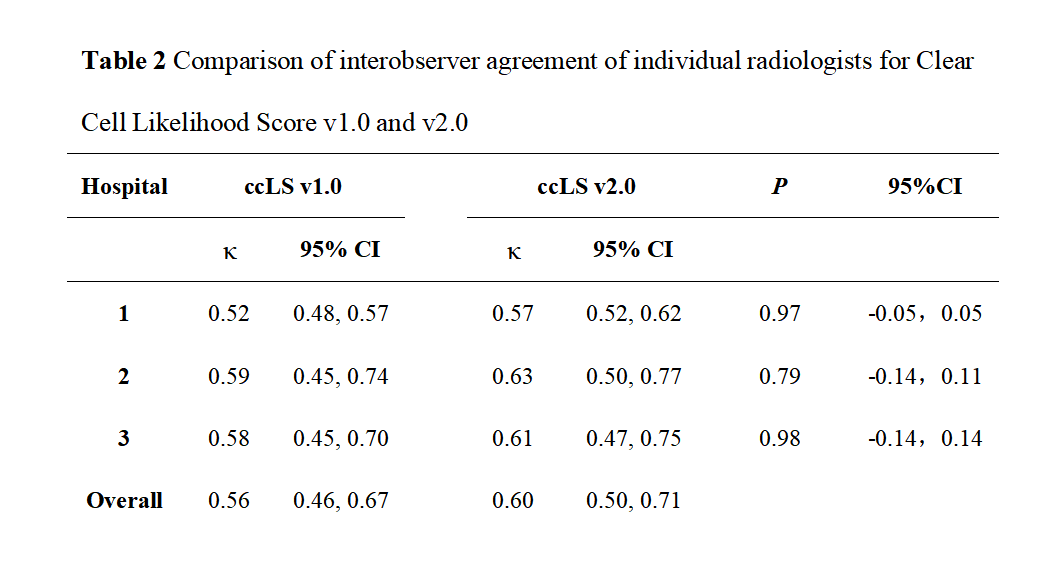 ccLS provides a new tool for the diagnosis and differential diagnosis of solid renal tumors and can be used to assist radiologists in their daily diagnosis. In this study, Six radiologists were trained in the ccLS algorithm and scored independently using ccLS v1.0 and ccLS v2.0, respectively. The results show that although the interobserver agreement between ccLS v1.0 and ccLS v2.0 is comparable, the diagnostic performance of ccLS v2.0 in ccRCC is better than that of ccLS v1.0 and ccLS v2.0 reduces the percentage of ccRCC in 1-3 scores. This finding is helpful to improve the clinical universality of ccLS.[1] Sebastià C, Corominas D, Musquera M, et al. Active surveillance of small renal masses[J]. Insights into imaging, 2020, 11(1):63.