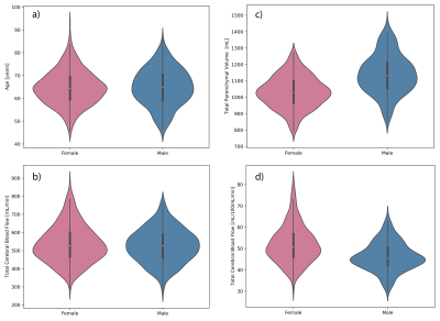 Cohort consisted of 754 cognitively healthy subjects (503F/251M; mean age=64y; age range=[45-93y]) from the Wisconsin Alzheimer’s Disease Research Center (Figure 1). 4D flow MRI data were acquired on three separate 3T clinical systems (GE Healthcare, Waukesha, WI): Discovery MR750 with a 32-channel head coil (N=561) or 8-channel head coil (N=46), Signa MR/PET with an 8-channel coil (N=8), or Signa Premier using a 48-channel coil (N=139). A non-contrast, radially-undersampled 4D flow sequence (PCVIPR2,3) acquisition was used with the following parameters: TR/TE=6.9-8.3/2.5-3.0ms; flip=8°; projections=11,000; isotropic resolution=0.69mm; image volume=22x22x10cm3; VENC=80cm/s; velocity encode scheme=4-point (N=320) or 5-point (N=434); scan time=5.6min or 7.1min, depending on encoding scheme. The data was reconstructed into 20 cardiac frames using retrospective peripheral pulse oximeter gating and temporal radial view sharing4. An interactive, semi-automated 4D flow processing tool (Figure 2), developed in Matlab2020b (Mathworks, Natick, MA), was used to measure mean volumetric flow rates in cervical internal carotid arteries (ICA) and basilar artery (BA). Flow rates from ICAs and BA were summed giving tCBF in mL/min. White matter (WM) and grey matter (GM) volumes were automatically segmented from T1-weighted MPRAGE and T2-weighted images using SPM125. Total parenchymal volume was computed as the sum of WM and GM volumes, measured in mL. tCBF was normalized by total parenchymal volume (normalized tCBF), expressed in mL of blood per 100 mL of brain parenchyma per min (mL/100 mL/min). Two sample t-tests were performed to compare (1) age, (2) tCBF, (3) total parenchymal volumes, and (4) normalized tCBF between male and female subjects. Simple linear regression models, in two groups (male and female subjects), were used to assess correlations between age and each outcome variable (tCBF, total parenchymal volume, and normalized tCBF).Results