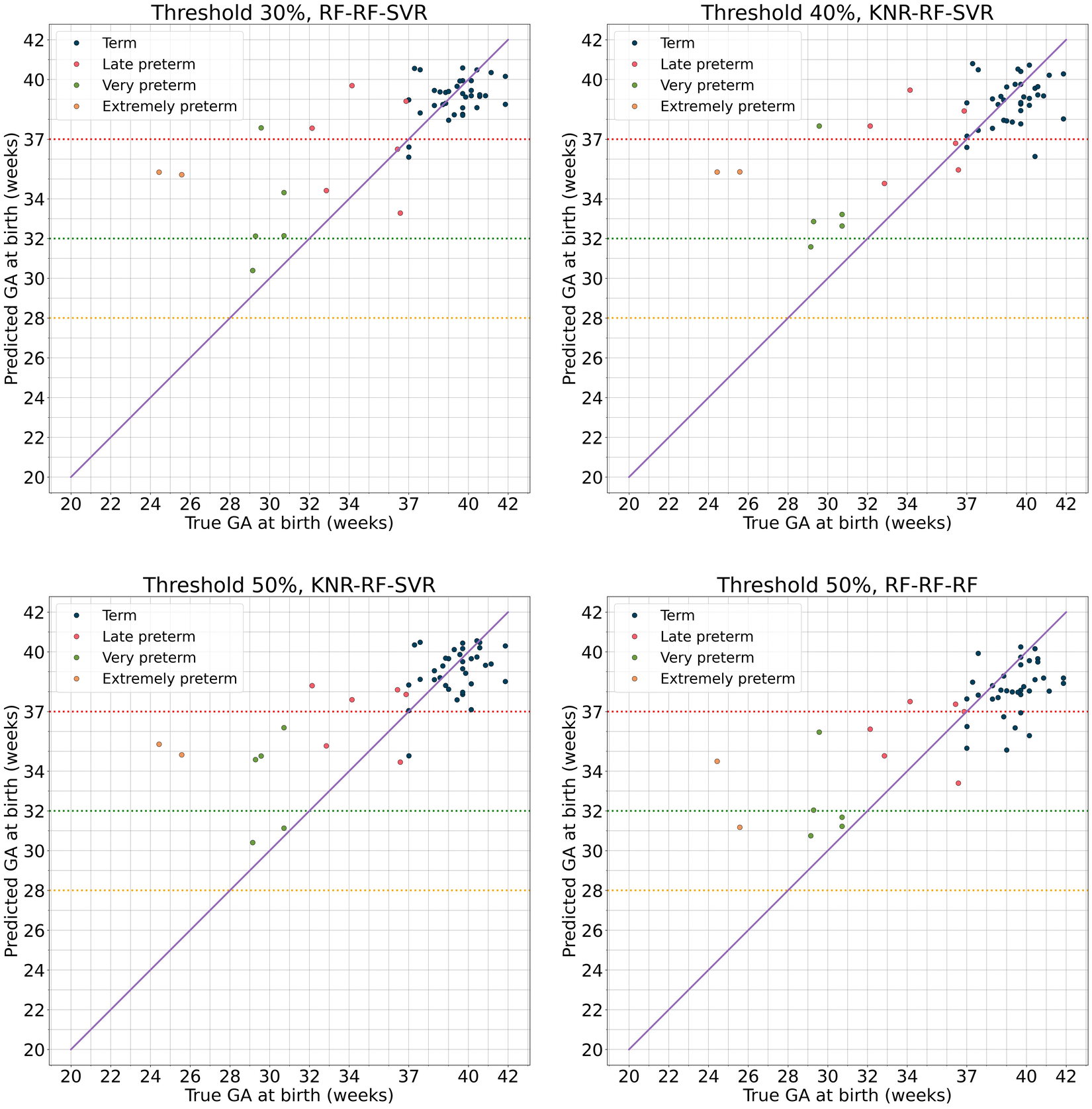 The accurate prediction of preterm birth is a clinically crucial but challenging problem due to its complex aetiology. In this work, data from fetal anatomical and functional multi-organ MRI acquisitions are used to train Random Forests and Support Vector Machines to predict gestational age at delivery. These predictions are classified as 'term' or 'preterm'. The model with highest sensitivity, a Random Forest, achieved 0.85 sensitivity, 0.81 accuracy, 0.8 specificity, 1.99 weeks Mean Absolute Error, and 0.58 R2 score. This work proves the potential of Machine Learning models trained on anatomical and functional MRI data to predict gestational age at delivery.1. World Health Organization. Preterm birth. Feb. 2018. url: https://www.who.int/news-room/fact-sheets/detail/preterm-birth.