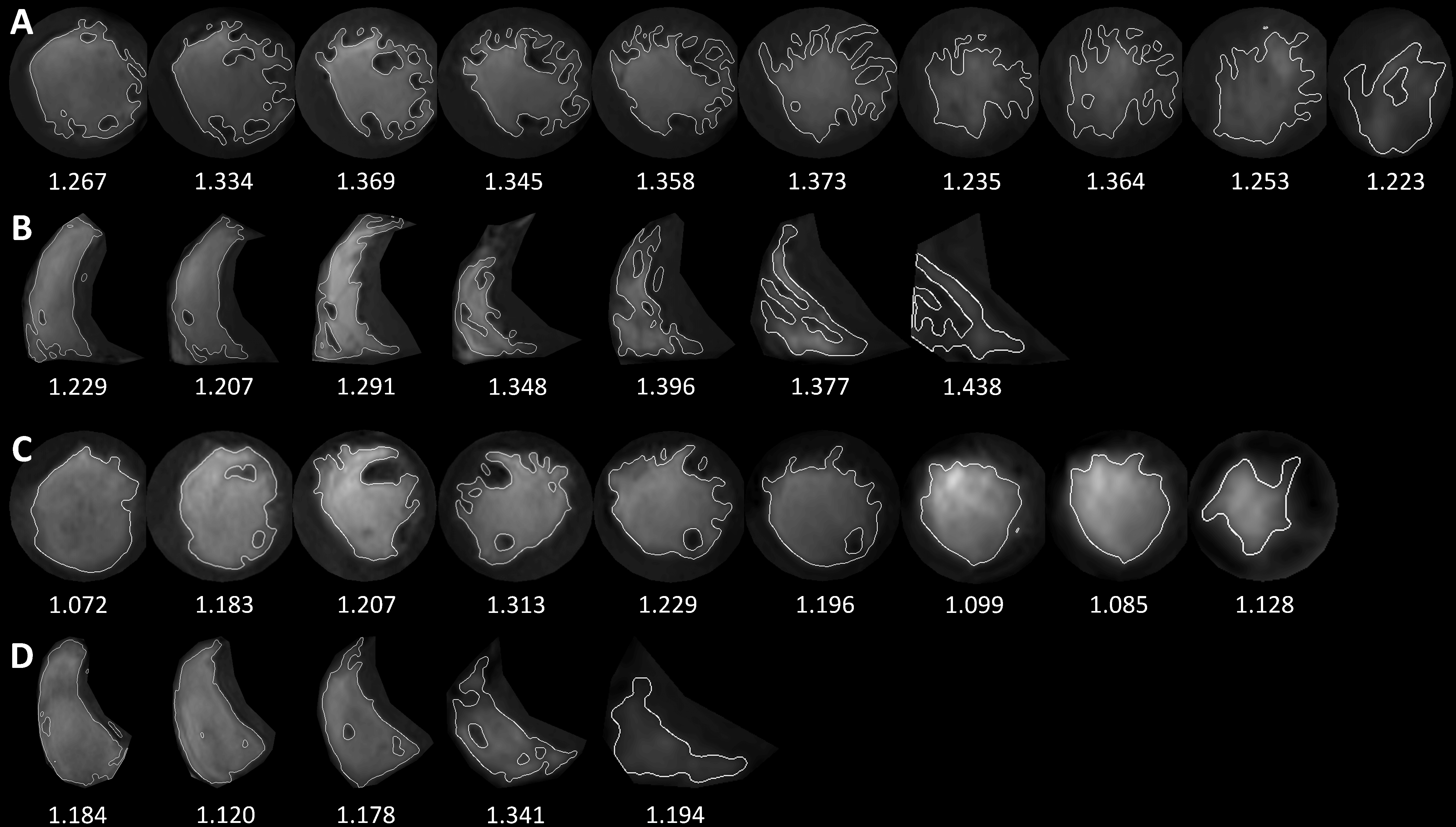 Figure 2. Fractal dimension (FD) images of two hypertrophic cardiomyopathy (HCM) patients. FracAnalyse software calculated the FD values automatically. A, B: left ventricular and right ventricular FD images of a patient who reached primary end point and with high biventricular FDs (LV max apical FD=1.374, RV global FD=1.327). C, D: biventricular FD images of a patient with no events and with low biventricular FDs (LV max apical FD=1.196, RV global FD=1.203).
