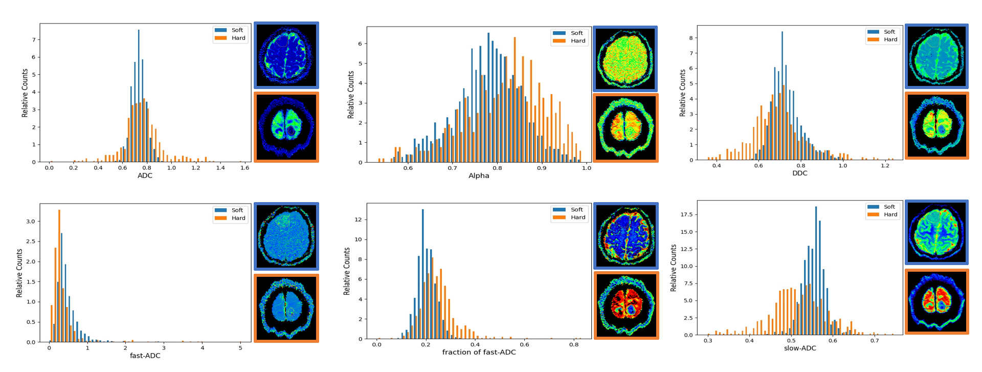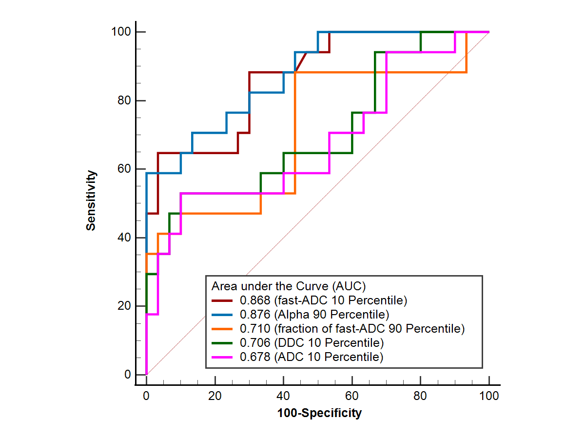 Our results demonstrated that the differentiation of soft and hard meningiomas is feasible by different models of DWI. Generally, we found that the histogram parameters (10, 90 Percentile) performed better than the conventional parameters like Mean or Median. DDC and ADC 10 Percentile were significantly lower in hard tumors than in soft tumors. It is probably due to the higher cell density of hard tumors. Fast-ADC 10 Percentile was significantly lower in hard tumors than that in soft tumors, while fraction of fast-ADC 90 percentile was significantly higher in hard tumors than that in soft tumors. It suggests the potential correlation between tumor microperfusion and consistency. Alpha 90 percentile was significantly higher in hard tumors than in soft tumors. This may intimate that hard tumors are more homogenous than soft tumors at the intravoxel level. In addition, Alpha and fast-ADC have significantly better diagnostic performances than the diffusion-related metric. It may indicate that intratumoral heterogeneity and perfusion contribute more to tumor consistency than cell density.Acknowledgements