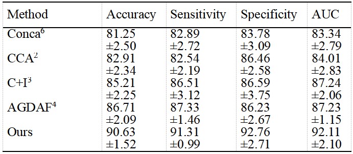 Our research shows that compared with matrix decomposition-based methods2,3, using the attention mechanism4 or our transformer with more powerful long-distance modeling advantages and flexible multimodal input mode can effectively learn the characteristics within and between modals. Evidently, the proposed M-JCT network is superior to the previously reported multimodality fusion methods for lesion characterization. In addition, our research shows that effective fusion of features within and between modes can bring better results, which indicates that they need to be treated differently with greater importance. In addition, inter modal information is used as a condition constraint to guide intra modal feature learning and further strengthen the discriminability of intra modal features.Conclusion