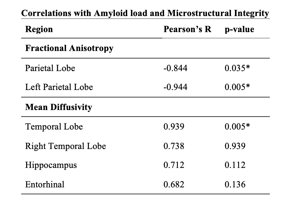 Here we have investigated associations between a known biomarker for aging and neurodegeneration, Aβ, plaques and measures for microstructural integrity (MD and FA) in an exploratory group of amyloid-negative adults. Normal microstructural dysfunction is characterized by decreases in FA and increases in MD. As amyloid load increased, we saw significant reductions in FA values within the parietal lobe, and in parallel, MD values increased within the temporal lobe. This could indicate that as Aβ load increases, that microstructural organization decreases. These microstructural changes may further relate to cognition(8) or underlying pathologies that contribute to progressive neurodegeneration. While these results are preliminary, and sample size may not provide enough power to detect robust effect sizes, with a larger, amyloid-positive sample, we may be able to feasibly leverages high resolution diffusion and extracts regional values that may relate to AD pathology with this method. This may result in changes in association between Aβ and microstructure. We hope to explore this relationship further with recruitment of more subjects including AD patients to develop novel insights in our understanding of the mechanisms and consequences of β-amyloid accumulation as it related to AD progression.Conclusion