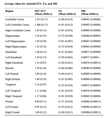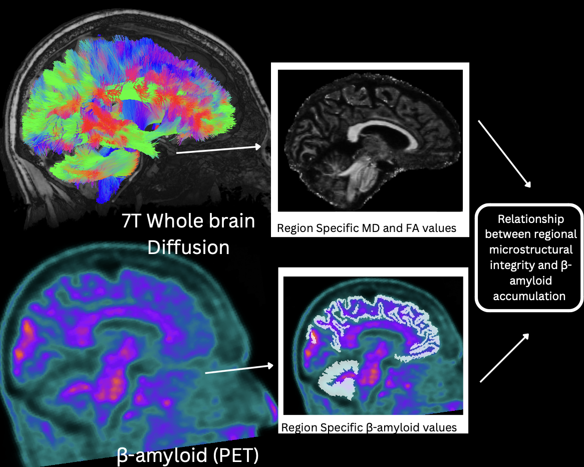 Progressive neurodegenerative conditions such as Alzheimer’s disease (AD), the leading cause of dementia have an immense impact on the aging population worldwide(1). AD has a long preclinical phase, and accumulation of beta-Amyloid (Aβ) plaques are believed to be one of the main pathogenic biomarkers of progressive neurodegeneration(2). β-amyloid can be detected through the utility of positron emission tomography (PET) with aid of a radioactive tracer or within cerebral spinal fluid acquired through a lumbar puncture. Since these two procedures are considered invasive, there is a profound need to identify non-invasive correlates of AD pathologies to aid in early detection or diagnosis, ultimately assisting in improved disease management or prevention. Diffusion tensor magnetic resonance imaging (DTI) is an MRI technique that can probe neural microstructure by measuring diffusion of water molecules and provide a metric for understanding the integrity of microstructure(3).Leveraging non-invasive tools such as ultra-high field (UHF), 7 Tesla (7T) MRI, with increased signal-to-noise ratio (SNR) and improved soft tissue contrast due to the higher magnetic field strength allows to map tissue microstructure (mean diffusivity (MD), and fractional anisotropy (FA)) in relation to Aβ accumulation(4) . 7T MRI enables better visualization and microstructure quantification within small regions where visualization may be limited due to size, proximity to sinuses or ventricles, inhomogeneity, signal dropout, and visualization compared to lower field strengths. Additionally, through increased SNR, 7T MRI provides increased accuracy of microstructural integrity estimates such as FA compared to lower field strength counterparts(5). Here we outline a method for leveraging UHF MRI and PET to better understand the progression of β-amyloid accumulation and the consequential effects on underlying microstructure.Methods