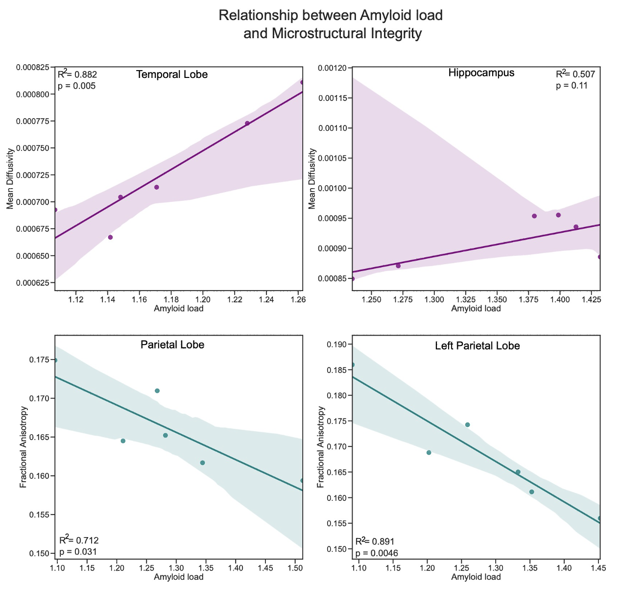 We provide proof-of-concept of a preliminary method that leverages UHF neuroimaging and PET to explore correlations between underlying microstructure of brain regions which effected by Aβ accumulation. We found significant positive association between Aβ and temporal lobe MD(R=0.939, p=0.0054)and negative association between Aβ and parietal lobe FA(R=-0.844, p=0.035)and left parietal FA(R=-0.944, p=0.005)(Figure 2).Additionally, we found that other regions such as the hippocampus and right entorhinal were trending towards statistically significant(Table 3).Discussion