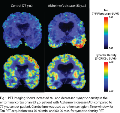 However, there is also evidence for a combined MR and PET approach to studying synaptic changes in neuropathology. One study uses both fMRI and SV2A PET to reveal how synaptic dysfunction and loss in dlPFC of patients with MDD/PTSD may lead to interconnectivity between dlPFC and PCC, which are typically in opposition to each other to separate internal and external thoughts in healthy patients. Finally, findings from human/animal studies propose future applications of SV2A PET imaging in neurodegenerative disorders and epilepsy, including early detection of Alzheimer’s, treatment response assessment of new Alzheimer’s drugs, and pre-surgical identification of seizure onset zone in epilepsy.CONCLUSION