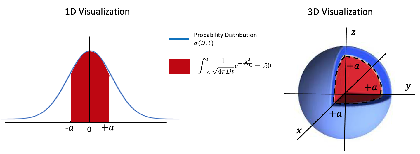 Pseudo-diffusion Mean Transit Time: Calibration of IVIM parameters to quantitative flow was calculated with the 3D probability distribution. MTT is the time it takes for half of the original molecules diffusing on average from the center of the voxel to have left the voxel. Knowing this, MTT can be calculated by solving the 3D diffusion probability distribution as a function of diffusivity for the time at which 50% of the molecules have traveled outside of the voxel from the center (Fig. 2). qCBF in ml/100g/min can then be calculated with this MTT using the central volume theorem[3]. Using this one can solve the 3D gaussian probability distribution as a function of time and diffusivity to determine IVIM qCBF in ml/100g/min.