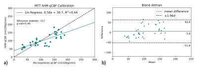 IVIM qCBF showed response to changing physiologic state (Fig. 1) and linear regression returned linear agreement and correlation to microspheres across physiologic state (Fig. 3a). Wilcoxon paired signed rank statistic = 317 and p-value =.44 showed no statistically significant difference between IVIM qCBF and microsphere perfusion. Bland-Altman analysis (Fig. 3b) returned a small mean difference = 5.9, and 95% CI [-51.8, 63.6] centered about zero.Discussion