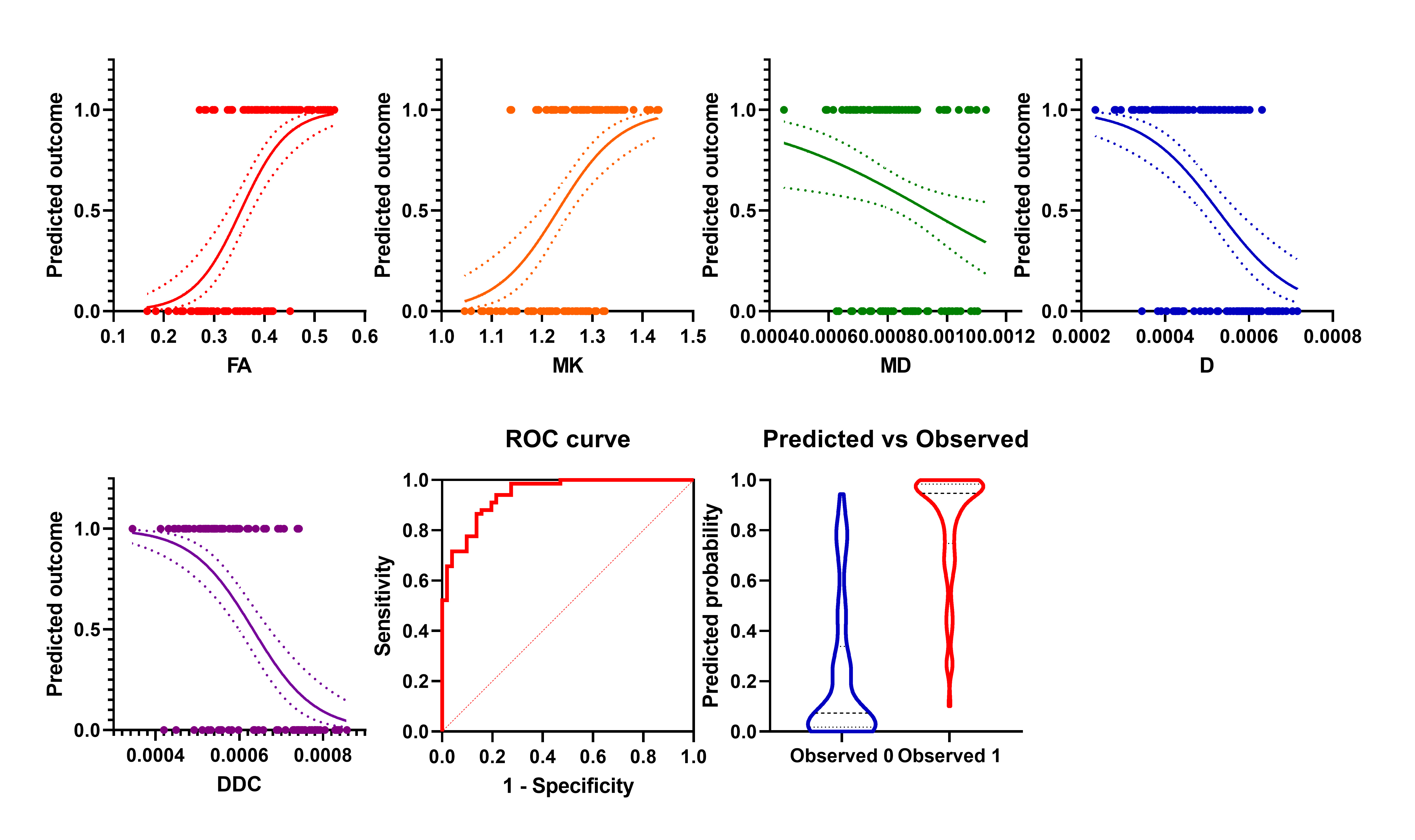 A total of 118 intermediate-risk group PCa patients were included, including 51 patients were FIRG (Figure 1), and 67 patients were unFIRG (Figure 2). Finally, the logistic model was statistically significant, χ2=90.969, p<0.001. The model could correctly classify 86.40% of the subjects. FA (p<0.001), MD (p=0.031), MK (p=0.014), D (p=0.041), DDC (p=0.001) were statistically significant. Odds ratio (CI 95%) were 6.856 (2.679-17.545), 3.597 (1.292-10.013), 3.018 (1.107-8.227), 0.411 (0.175-0.962), 0.177 (0.062-0.510), respectively (Figure 3). The results of ROC analysis showed that area under the curve (AUC) was 0.9429, CI 95%: 0.9054-0.9805. Sensitivity, specificity, positive predictive value and negative predictive value were 88.06%, 84.31%, 88.06% and 84.31%, respectively.Discussion