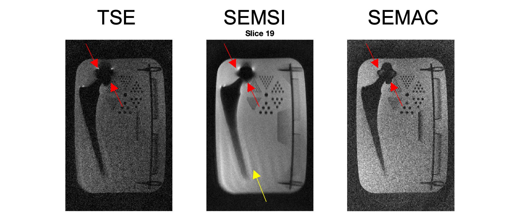 Experiments were performed using a whole body 0.55T system (prototype MAGNETOM Aera, Siemens Healthineers, Erlangen, Germany) equipped with high-performance shielded gradients (45 mT/m amplitude, 200 T/m/s slew rate). A total hip arthroplasty (THA) phantom with cobalt chrome (CoCr) head and titanium (Ti) stem was scanned using SEMSI, SEMAC, and 2D TSE. Imaging parameters were TE = 25 ms; TR = 3900 ms; matrix size = 256x160; in-plane resolution = 1.2x1.2 mm2; ETL = 7; readout bandwidth = 1028 Hz/pixel; RF bandwidth = 0.5 kHz and 40 slices with slice thickness of 1.5mm for SEMSI; RF bandwidth = 1 kHz and 30 slices with slice thickness of 2mm for SEMAC (minimum slice thickness). 6 phase-encoding steps along the slice direction were used for SEMAC (SEMAC-6).
