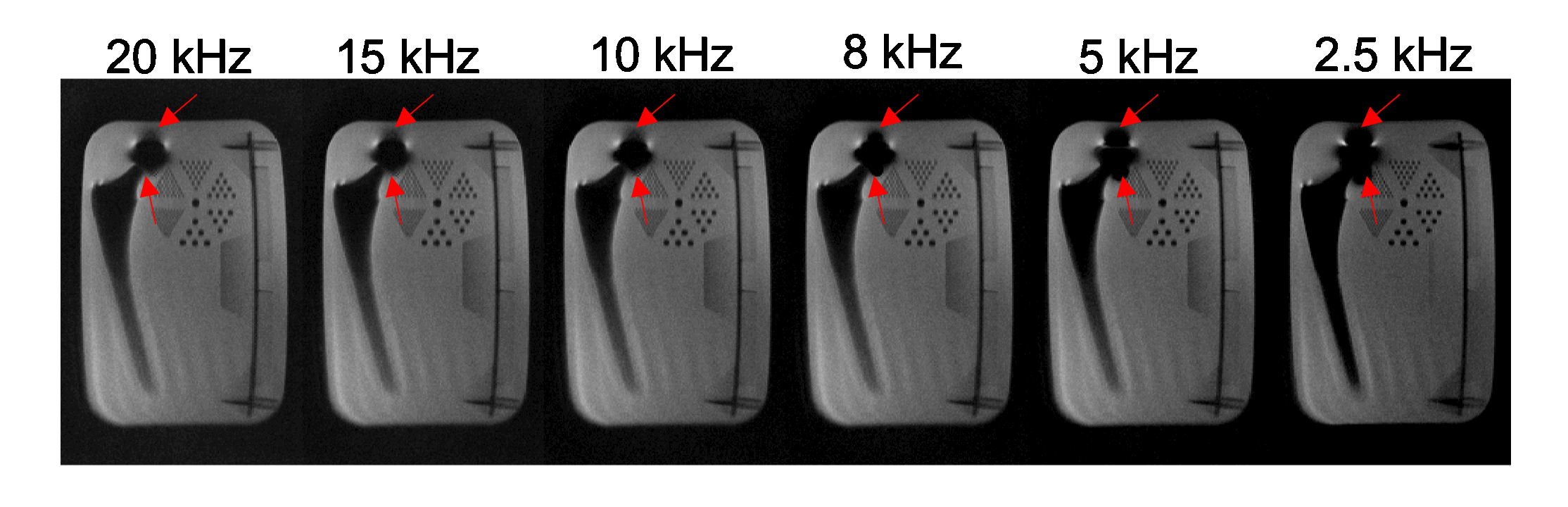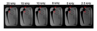 At 0.55T, the spectrum bandwidths of both cobalt chrome and titanium are less 20 kHz. ∆TE for the SEMSI acquisition were [-1000:50:950] us which results in a spectral FOV of 20 kHz with spectral resolution ∆f of 0.5 kHz. To examine the impact of spectral FOV for two different metal materials, Retrospective sub-sampling along ∆TE dimension was by 25%, 50%, 60%,75%, 87.5% from the 0.5 kHz SEMSI data to obtain the spectral FOVs of 15 kHz, 10 kHz, 8 kHz, 5 kHz, and 2.5 kHz with the same ∆f of 0.5 kHz.RESULTS: