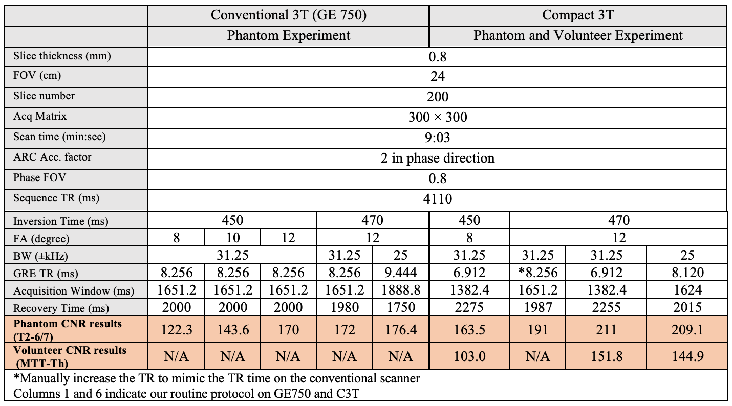 Healthy subject scanning: To validate phantom results, a healthy volunteer subject was scanned on the C3T MRI system with high performance gradient [4] under an IRB-approved protocol after obtaining written consent. Our original and modified FGATIR protocols were acquired (Table 1). The imaging protocols for both phantom and subject scans are shown in Table 2. The BW was reduced from ±31.25 to ±25 kHz to extend the TR time on the C3T (6.912 ms to 8.12 ms) to match with the TR time (8.256 ms) on the conventional 3T scanner (GE750) with ±31.25 kHz bandwidth, which demonstrates the benefit of the C3T’s high-performance gradients for reducing TR. ROIs were drawn to calculate the MTT-thalamus CNR (Fig. 3).Results