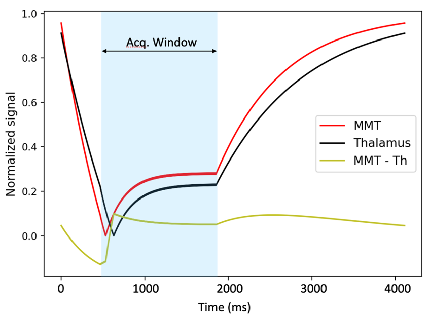 In previous studies[5, 6], simulations based on the Bloch equations have been performed to examine signals evolution of WM, GM, and their difference during the acquisition phase of FGATIR. The goal has been to maximize WM-GM contrast. However, tracking MTT in thalamus for DBS targeting could benefit from a closer investigation of the MTT-thalamus contrast behavior. We observed higher MTT-thalamus contrast from both phantom and volunteer scanning at a higher FA (e.g., at 12°) and a TI time of 470ms (Table 3&4).
