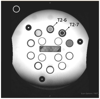 Phantom scanning: The ISMRM/NIST T1/T2 phantom [7] was scanned to quantitatively evaluate the contrast dependency on the parameters of interest. The T2 array was used as samples T2-7 and T2-6 have T1 and T2 values close to MTT and thalamus (Table 1). ROIs were drawn on T2-7 and T2-6 samples to calculate the contrast-to-noise ratios (CNR) [8] (Fig. 2). Search was performed until the best contrast was achieved to determine the optimized parameters.